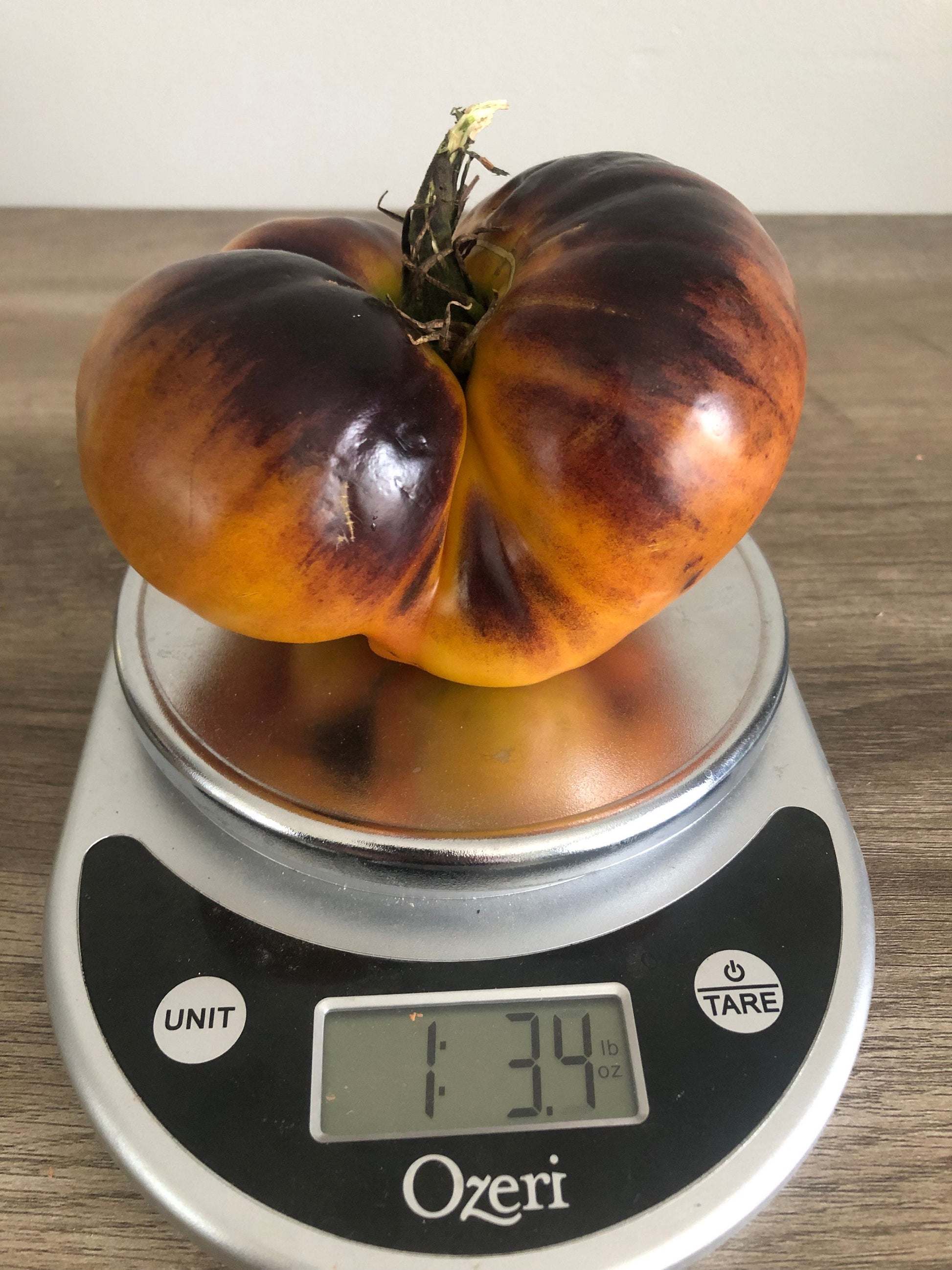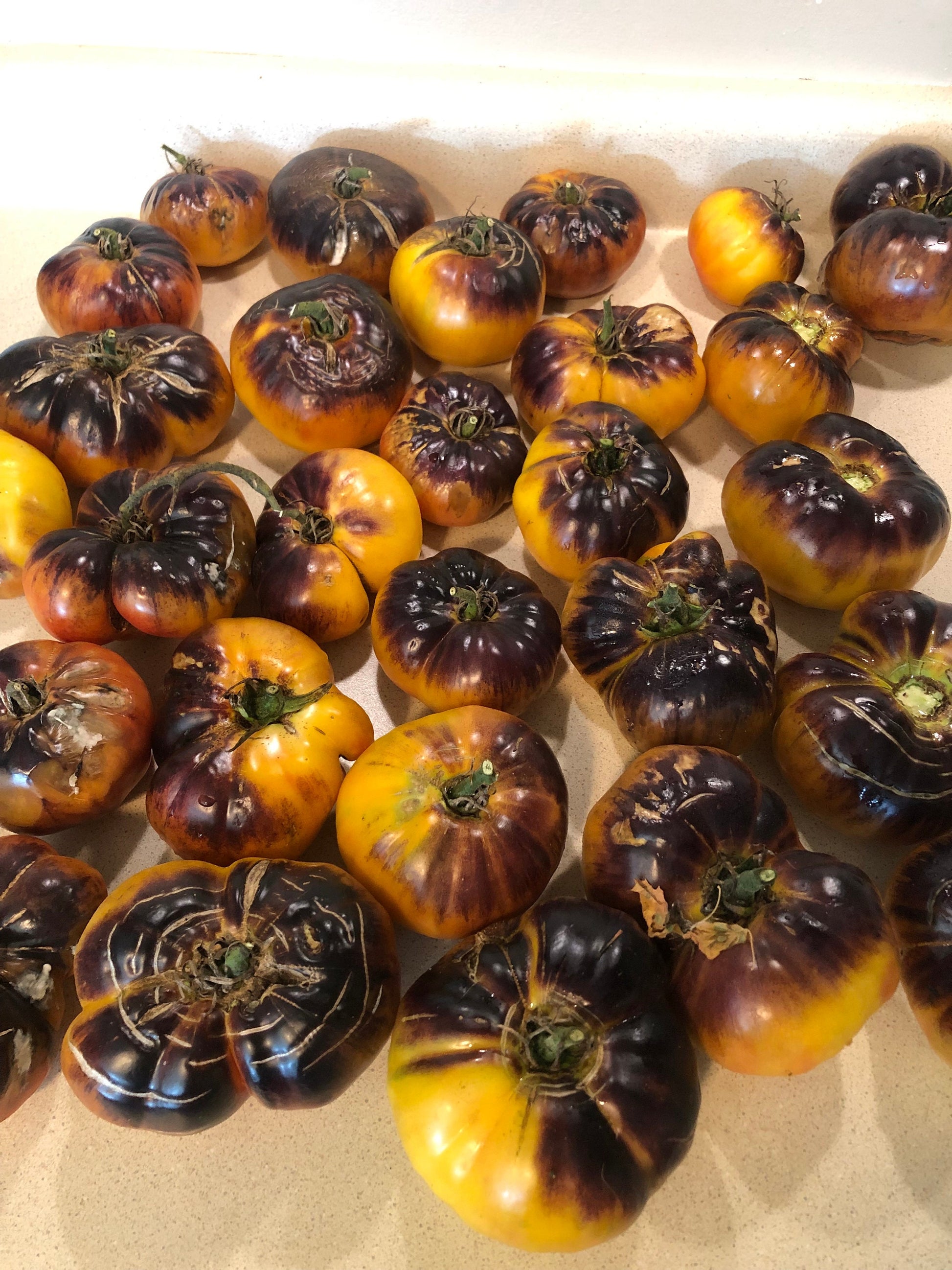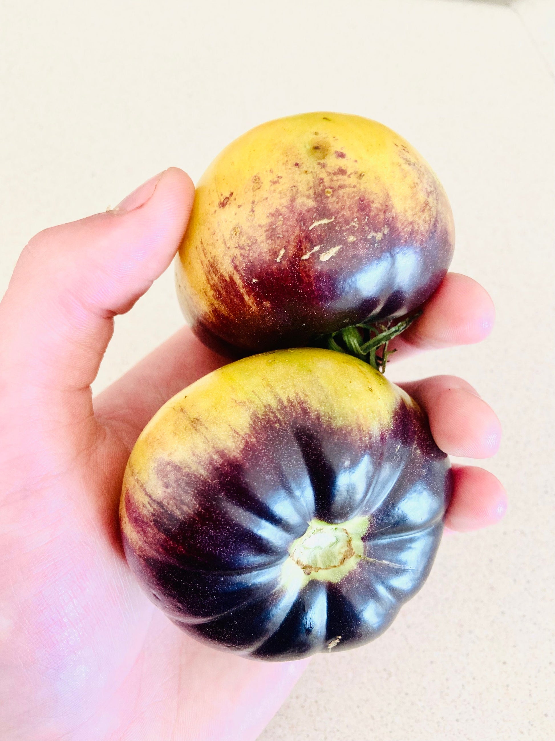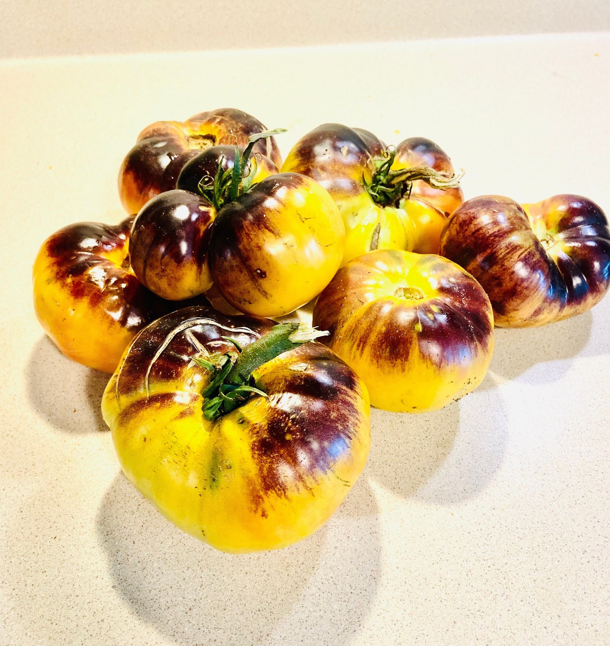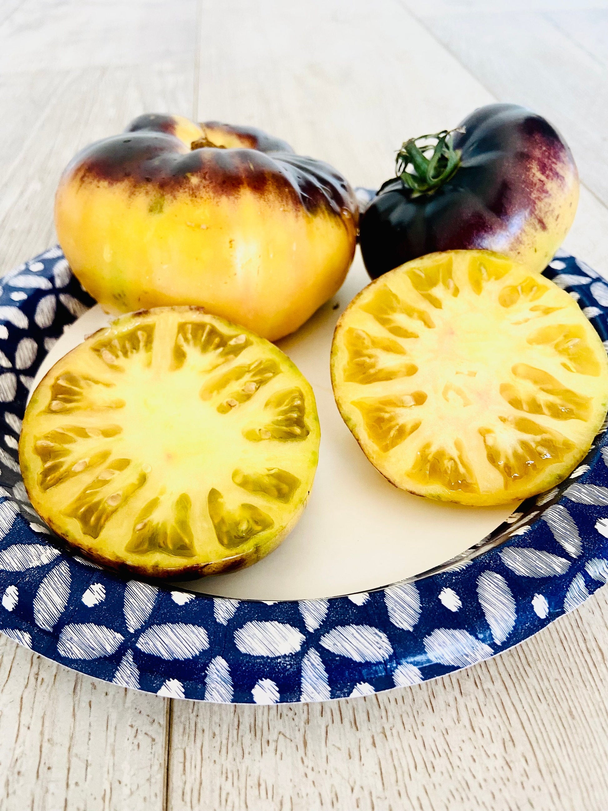 The absolute most beautiful coloration that we have seen in a tomato! A Large slicing variety with a unique coloration! Most fruits exhibit a dark purple top, that fades into a yellowish orange! Fruits have a delicious tropical tomato taste that is too good to describe! Staking is necessary as these fruits can get upwards of 1 pound each! A great slicing tomato for sandwiches, or burgers! This will be a real eye catcher in your garden!
