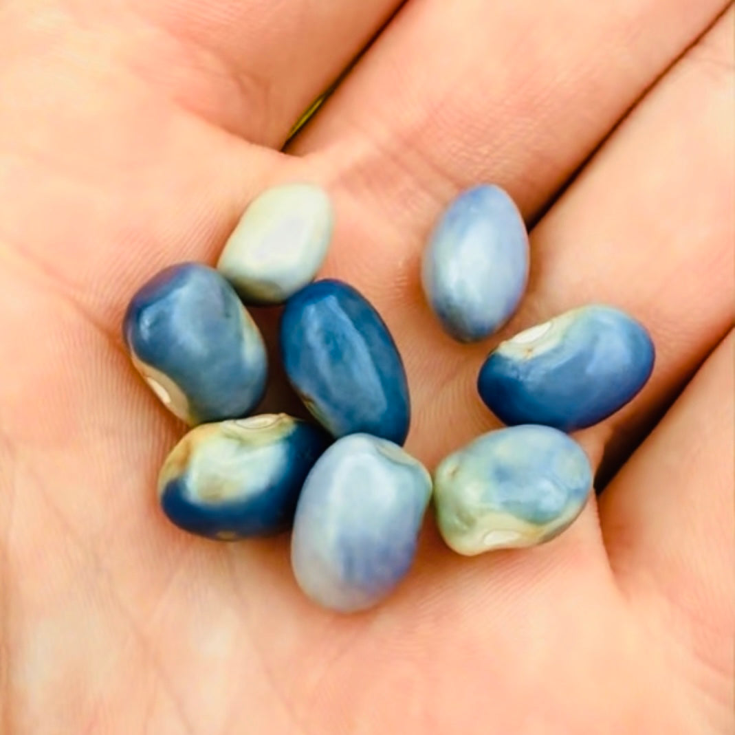 The plants themselves are extremely prolific, getting 10-20 ft tall with sturdy green stems and lush, medium-green foliage that creates a vibrant backdrop for the jewel-toned pods. The contrast of the bright pink flowers against the fresh green leaves makes them highly ornamental! Inside, the seeds are typically smooth and BLUE that sets them apart from all other beans!