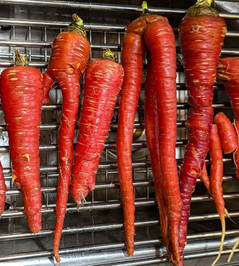 The Atomic Red carrot is a beautiful heirloom variety known for its bold, deep red skin that intensifies when cooked. Long and tapered, these roots typically reach 8–10 inches, with smooth, firm flesh that has a sweet yet slightly earthy flavor. Their vivid color comes from high levels of lycopene, the same antioxidant found in tomatoes, which makes them both beautiful and nutrient-rich. Crisp when eaten fresh and richly flavored when roasted, Atomic Red carrots bring both visual flair and nutrition to the garden and kitchen.