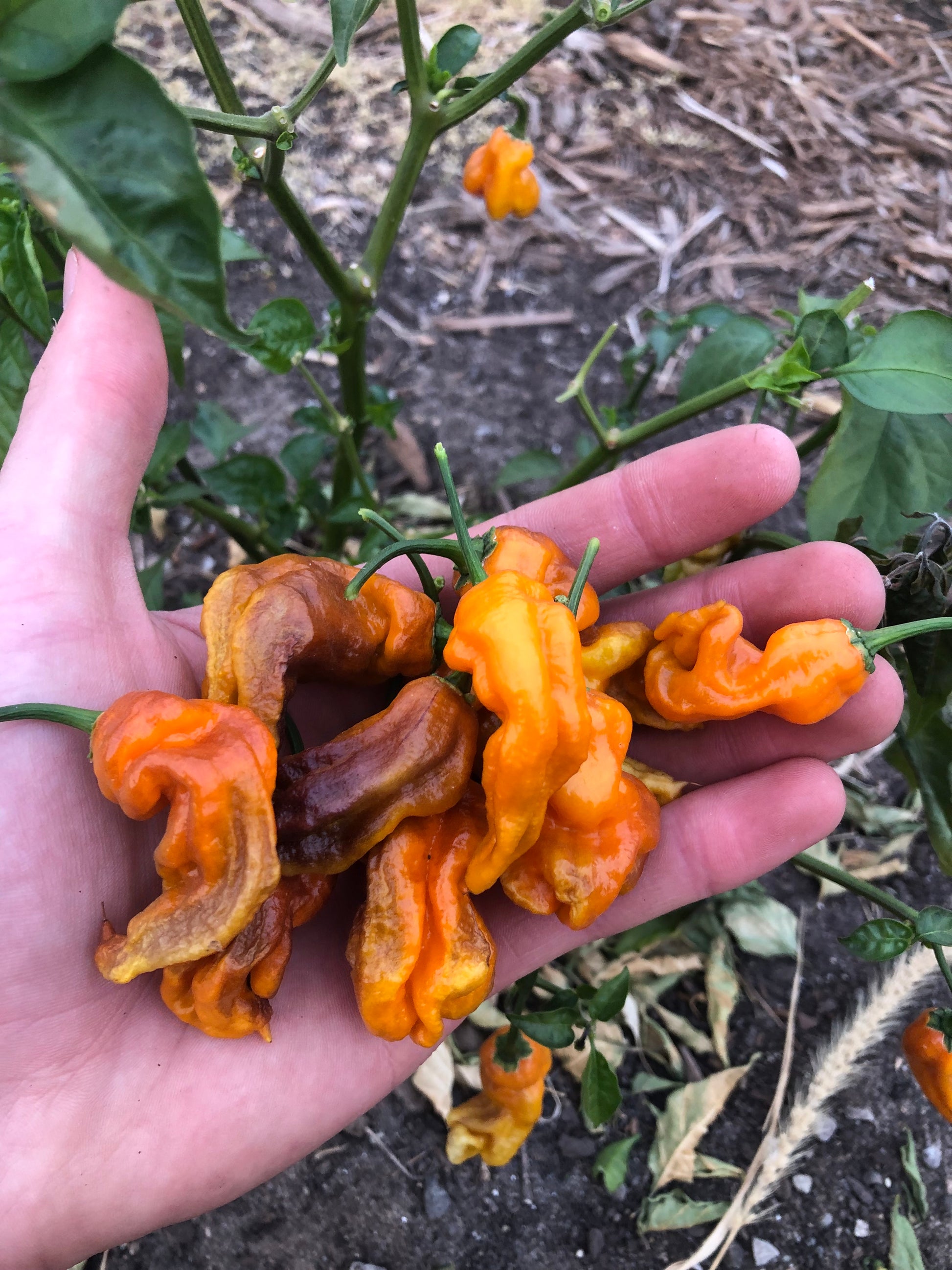 The most unique pepper we grew in 2024! This is the only pepper we know of to have a skin that feels like wax! Rubbery and nothing like any pepper we have grown. Peppers start out green, then ripen to yellow with golden brown scattered throughout the pods with some purple. Heat level is definitely super hot, and estimated around 1 million schoville units! a scorcher in the pepper world! Plants are extremely prolific and reach around 3-5 ft