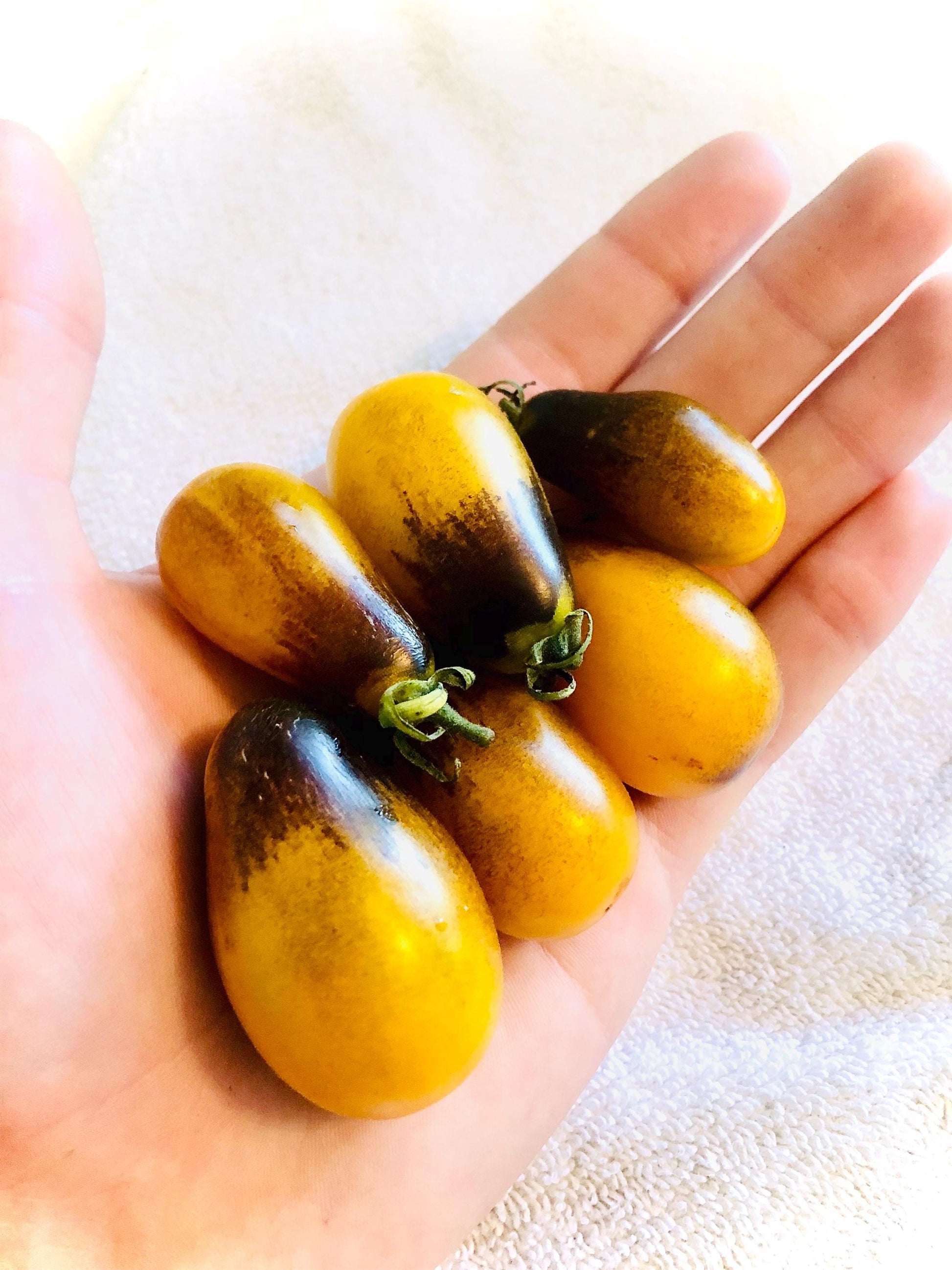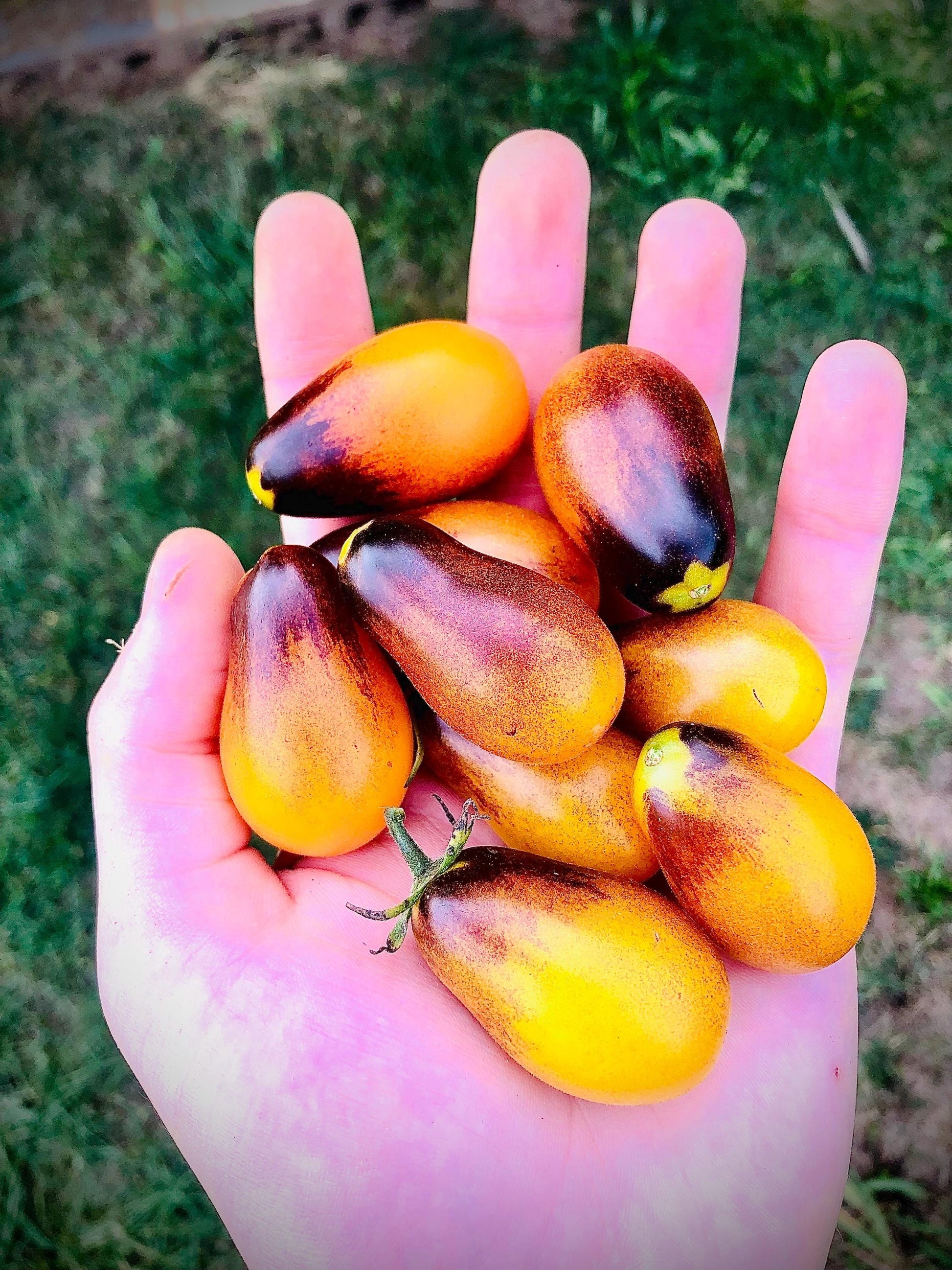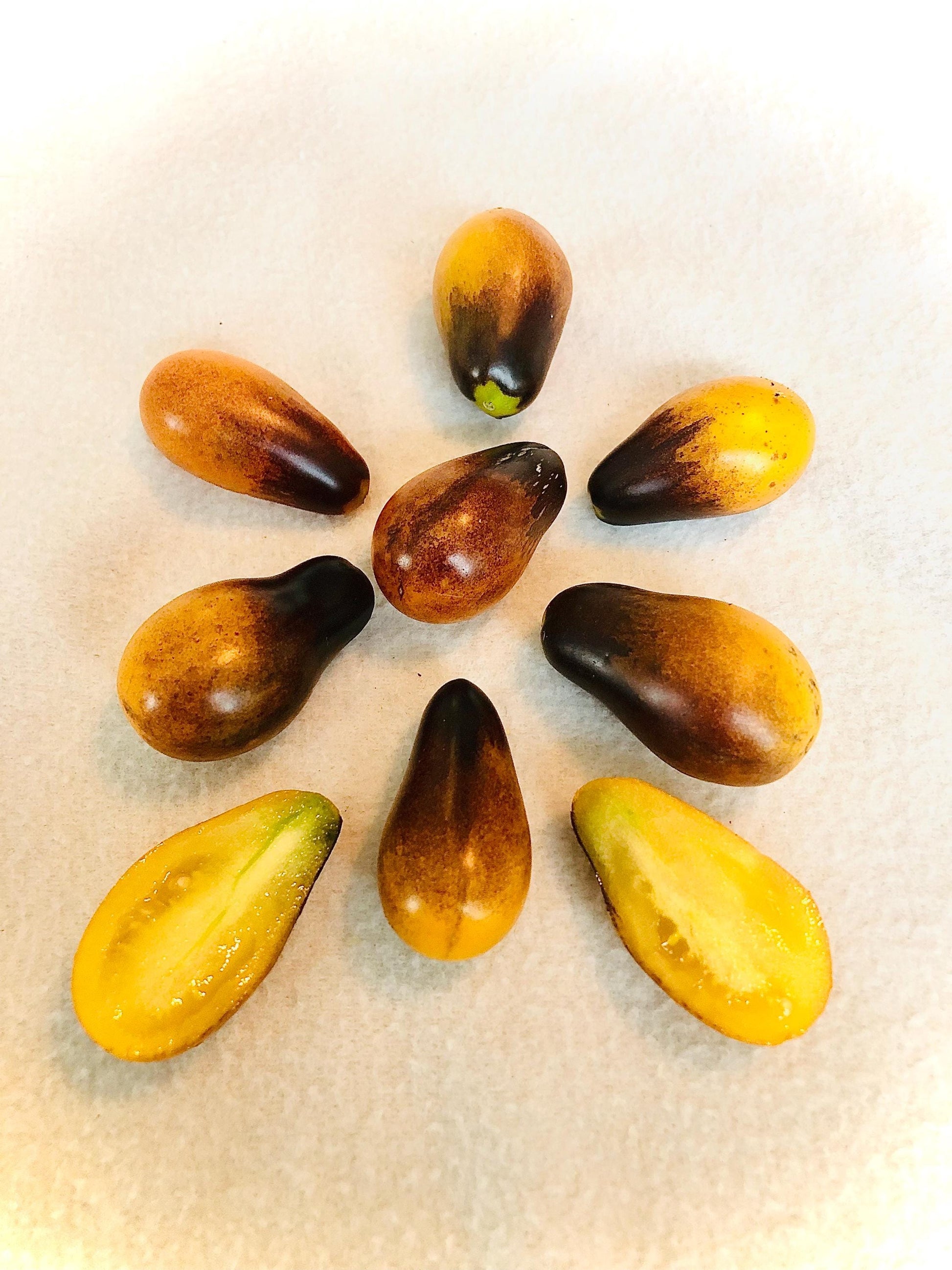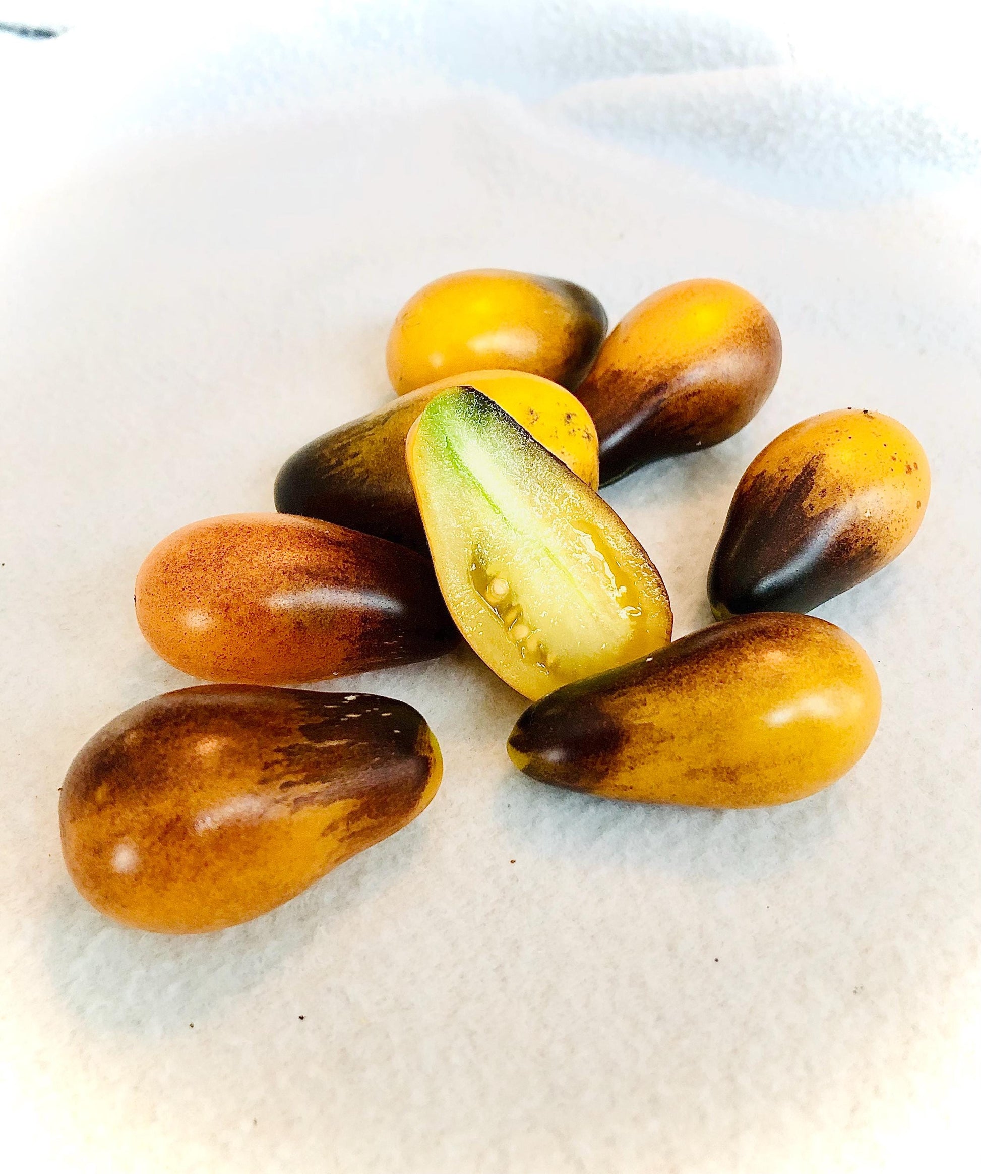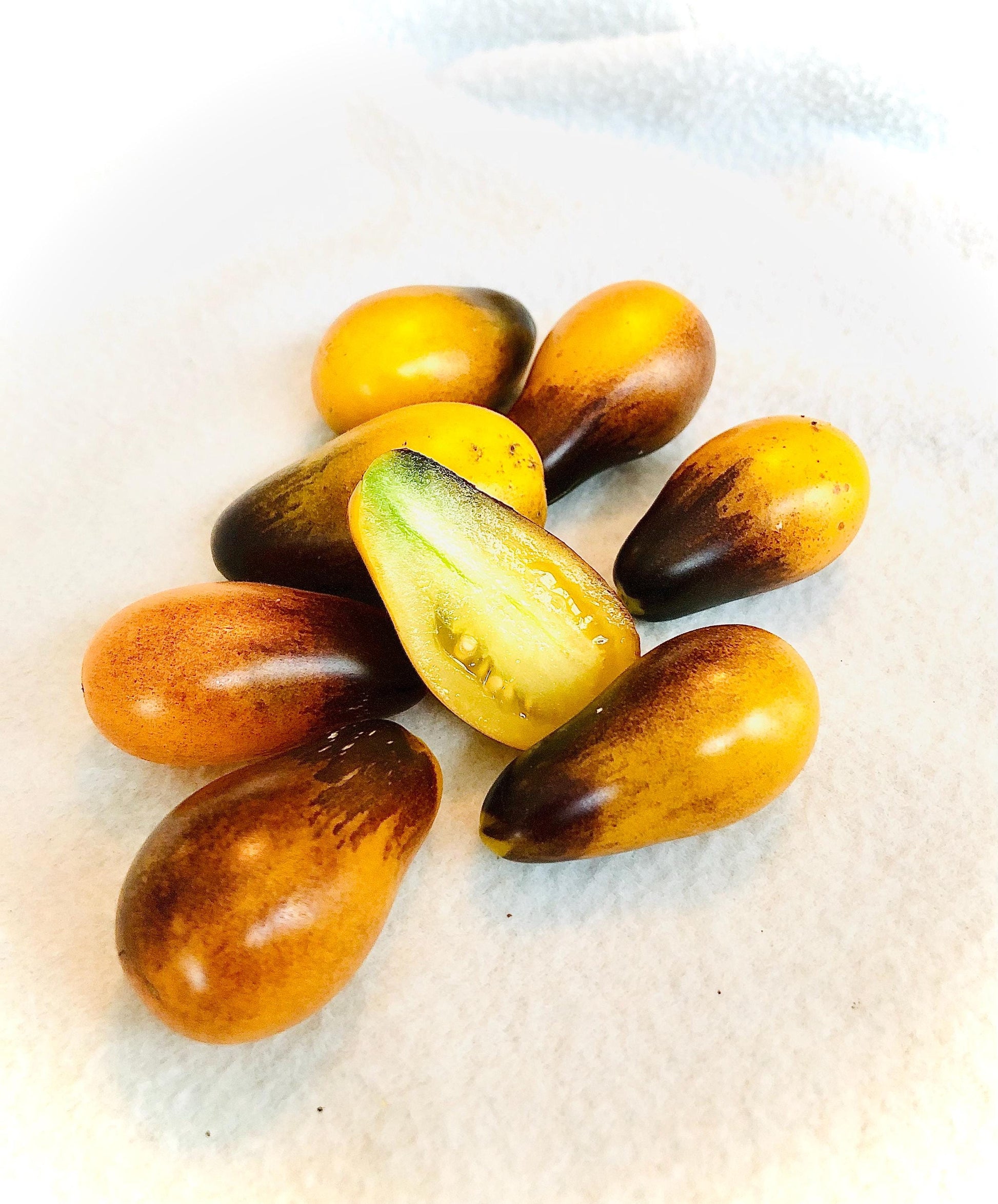 a small grape type tomato. Plants get loaded with fruits early in the season and ripen a deep golden yellow color with black brush strokes over the top. Flavor is mild and creamy, with just the right amount of sweetness. A rare and delicious treat!