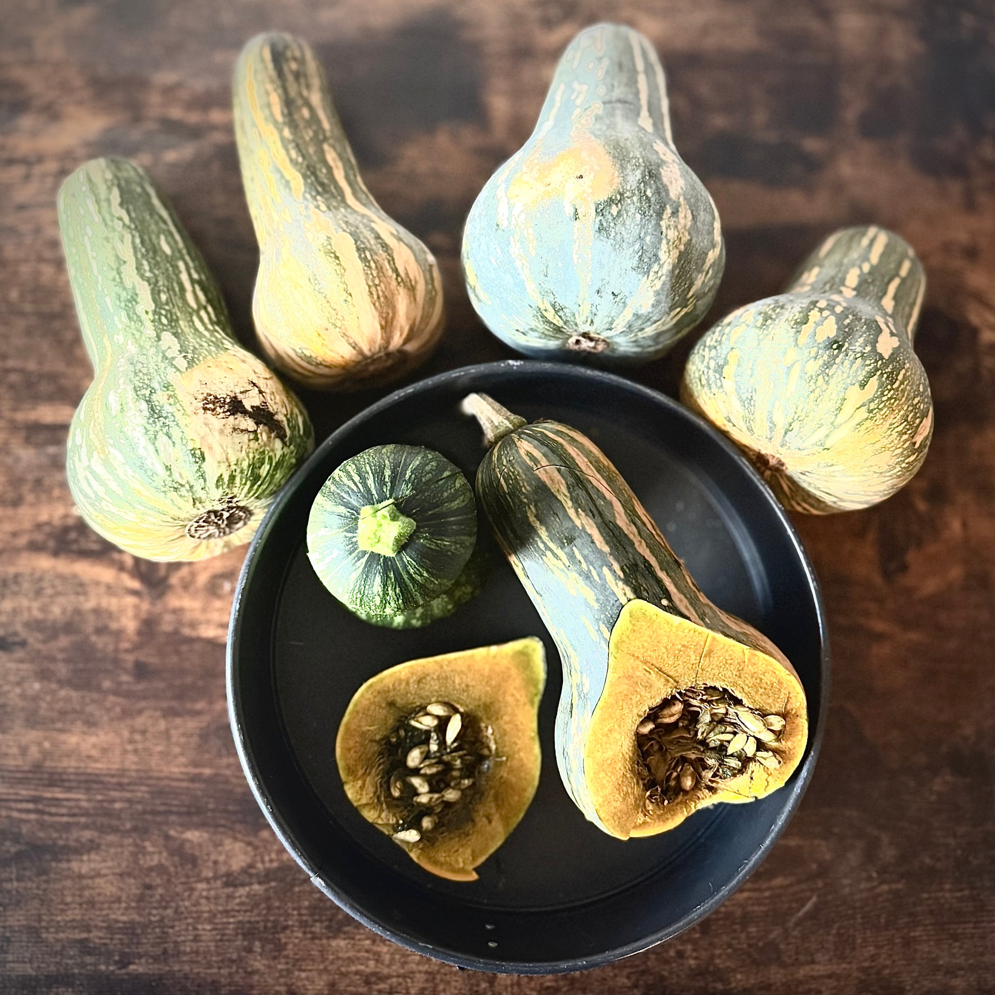 Ayote Green-Fleshed Squash — A traditional Central American heirloom prized for its rich flavor and resilience. The Ayote produces large, round-to-oblong fruits with tough, mottled green rinds that protect the beautifully vibrant green flesh within. The flesh is dense, smooth, and slightly sweet with nutty undertones—excellent for roasting, soups, or mashing. When cooked, it develops a creamy texture similar to pumpkin or kabocha but with a distinctive earthy sweetness. Highly productive and adaptable, this squash stores well and thrives in warm climates.