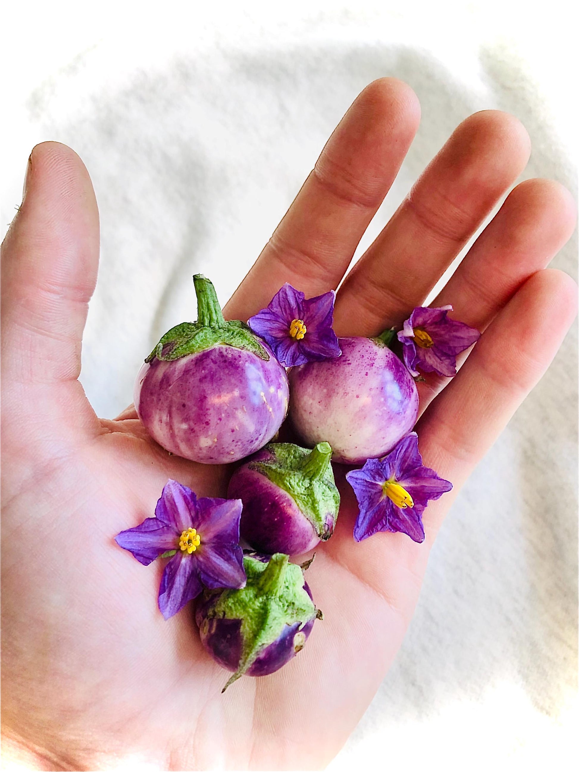 A gorgeous eggplant from Thailand. These mini gems are just one inch in diameter but pack so much flavor! Delicious in stir fries and other recipes that call for eggplant. The purple, pink, and white color patterns these fruits give off make them one of the most ornamental eggplant varieties out there and produce a ton of flowers and fruit later in the season.