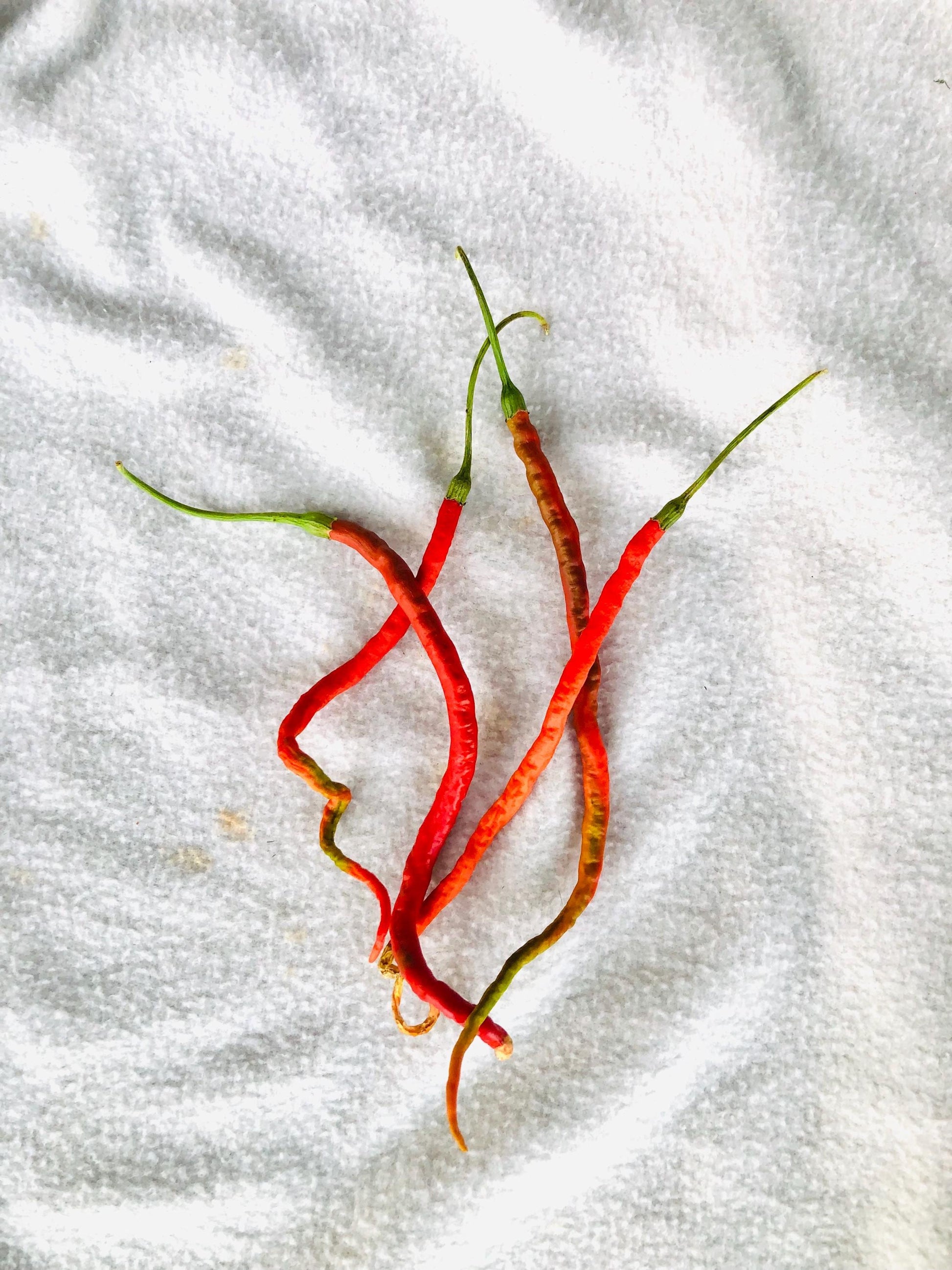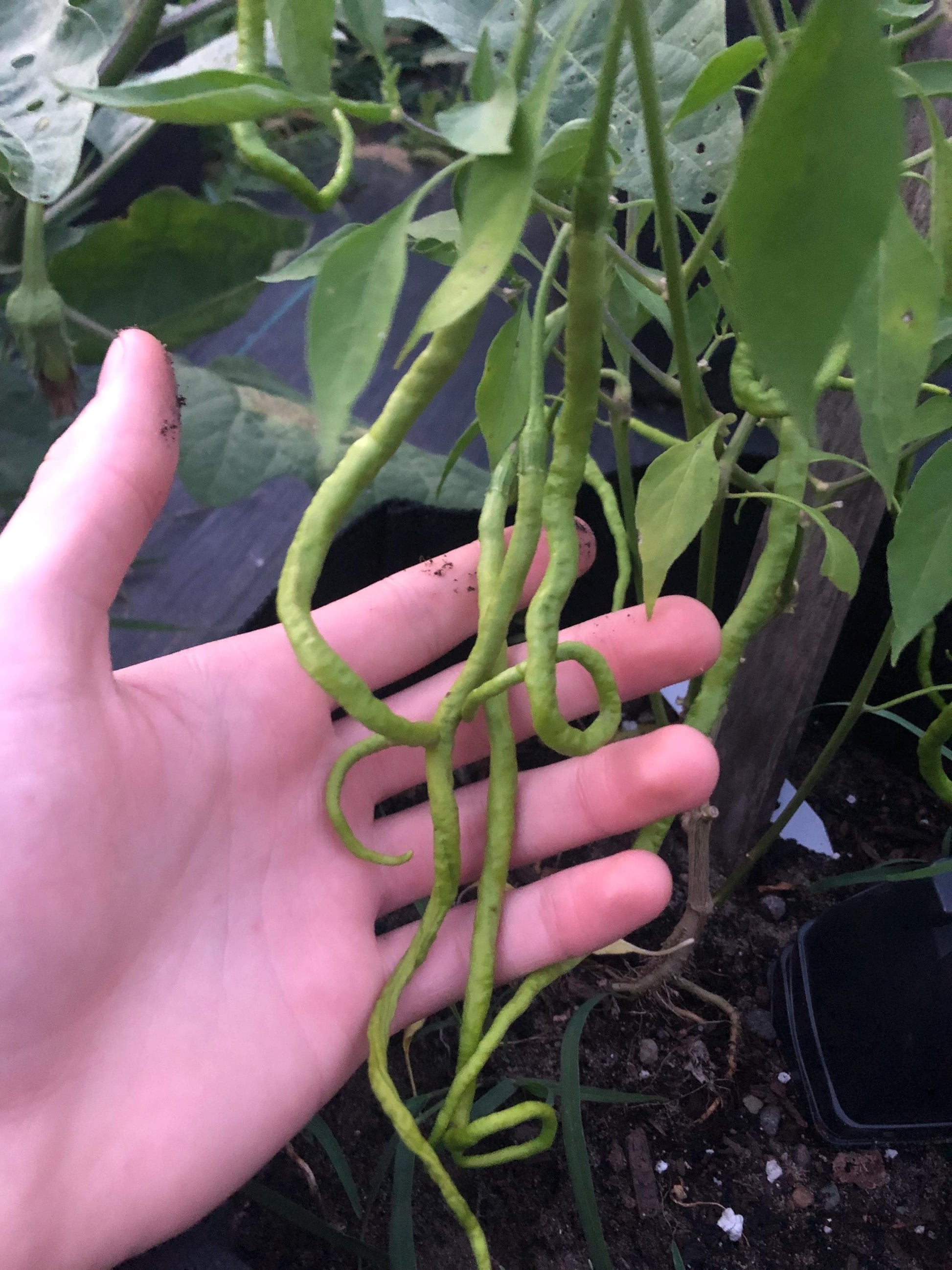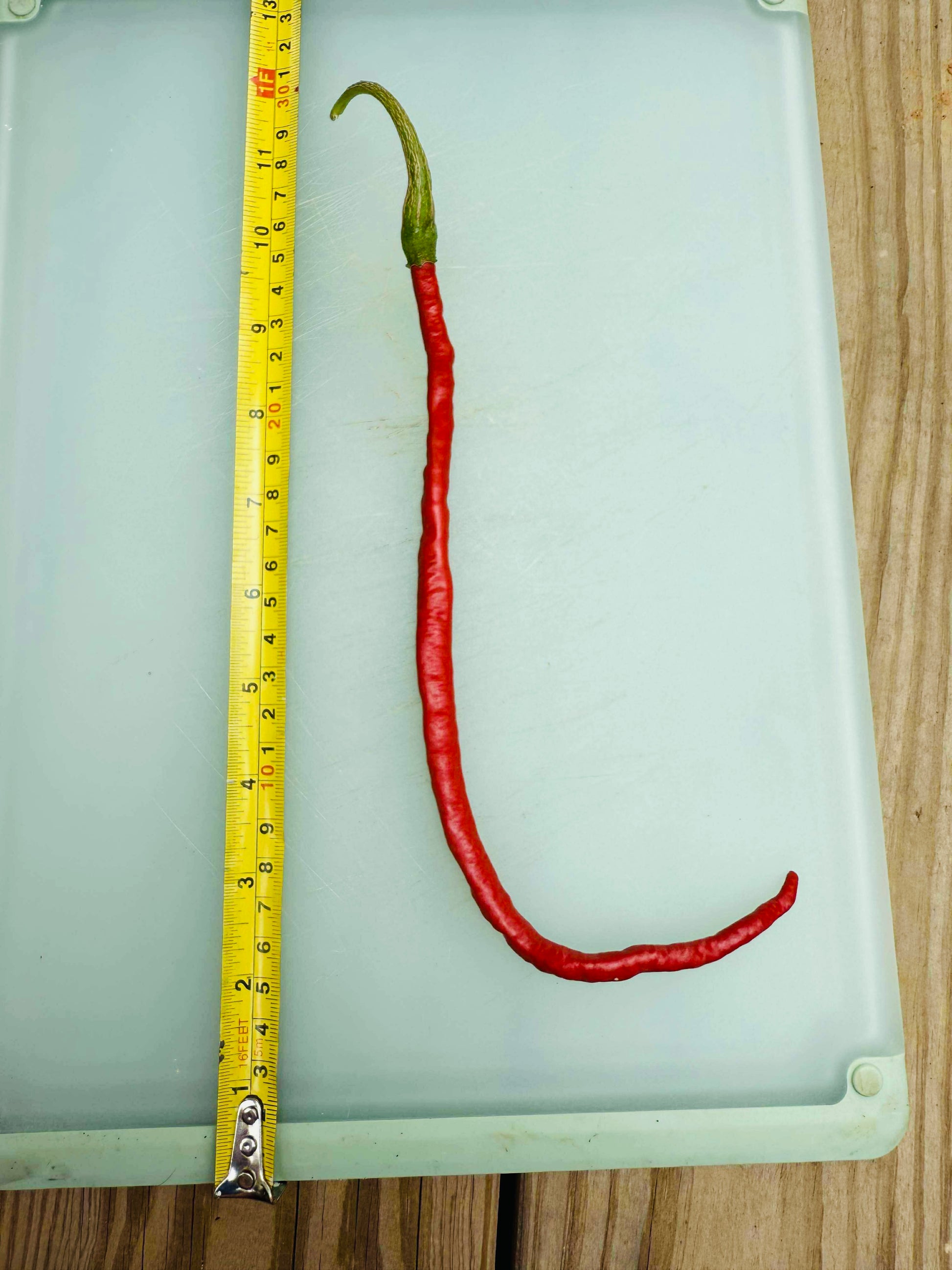 This rare Chinese variety from Guizhou’s Thunder Mountain region grows some of the world’s longest chili pods—often 10–16 inches, sometimes even longer! Pods are thin-walled, twisting, and ripen from green to bright red. The flavor is slightly sweet and smoky with medium heat (about 20,000–40,000 SHU). Plants reach 3–4 feet tall and produce heavily, making them both ornamental and productive. Excellent for drying, stringing, or using fresh in stir-fries and sauces.