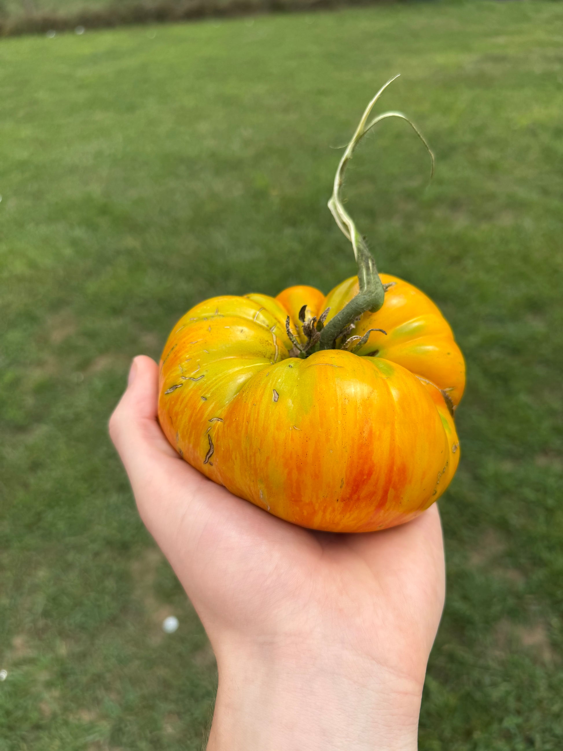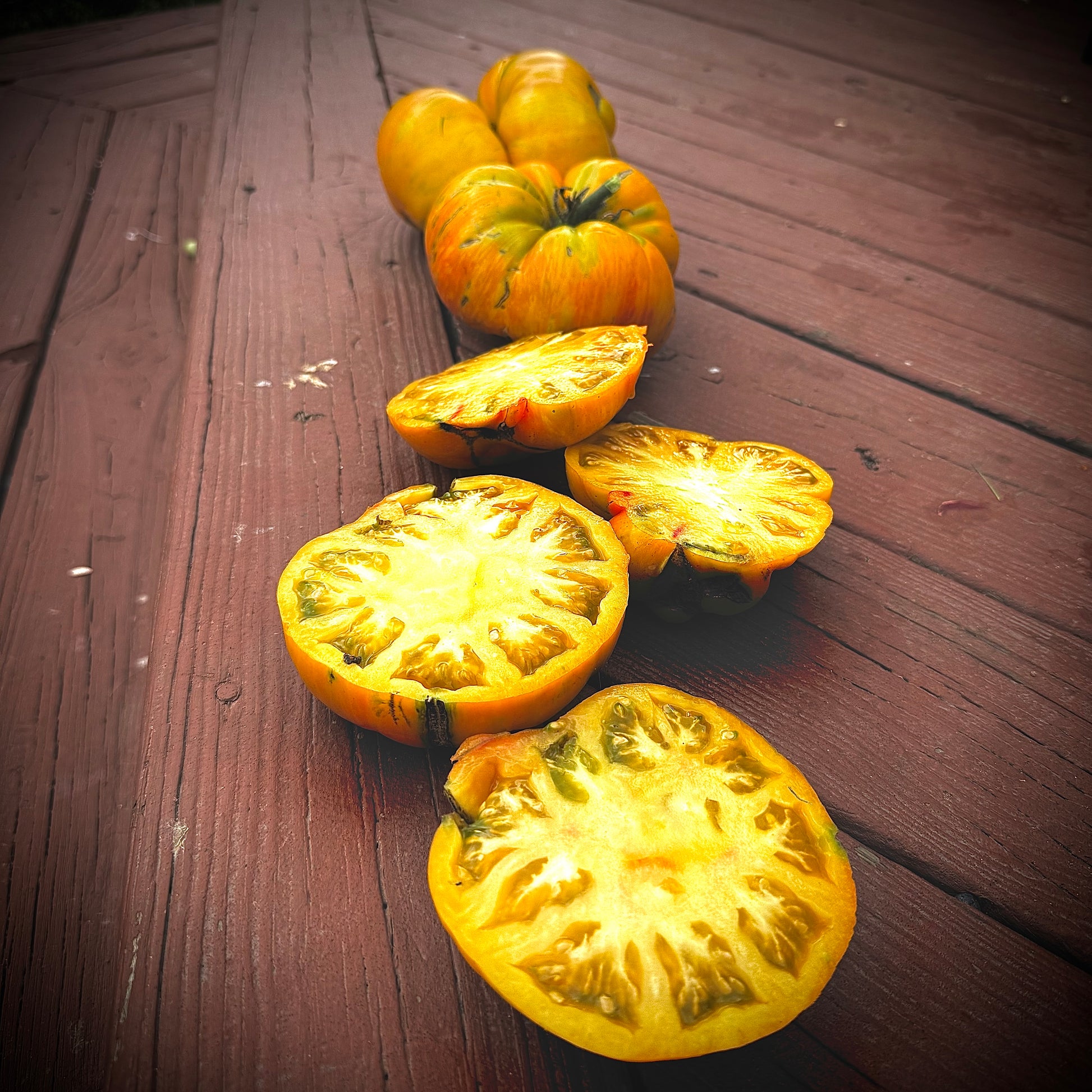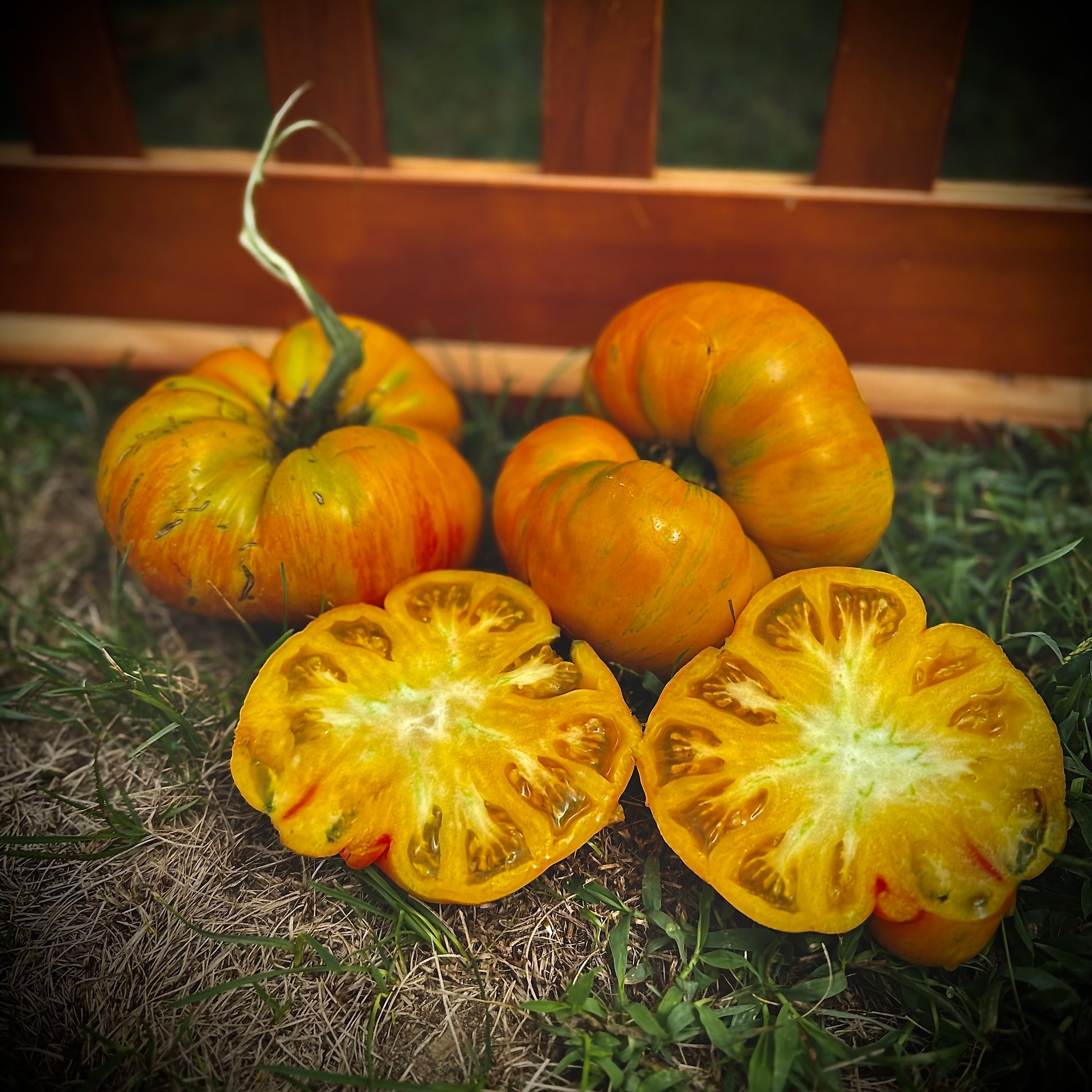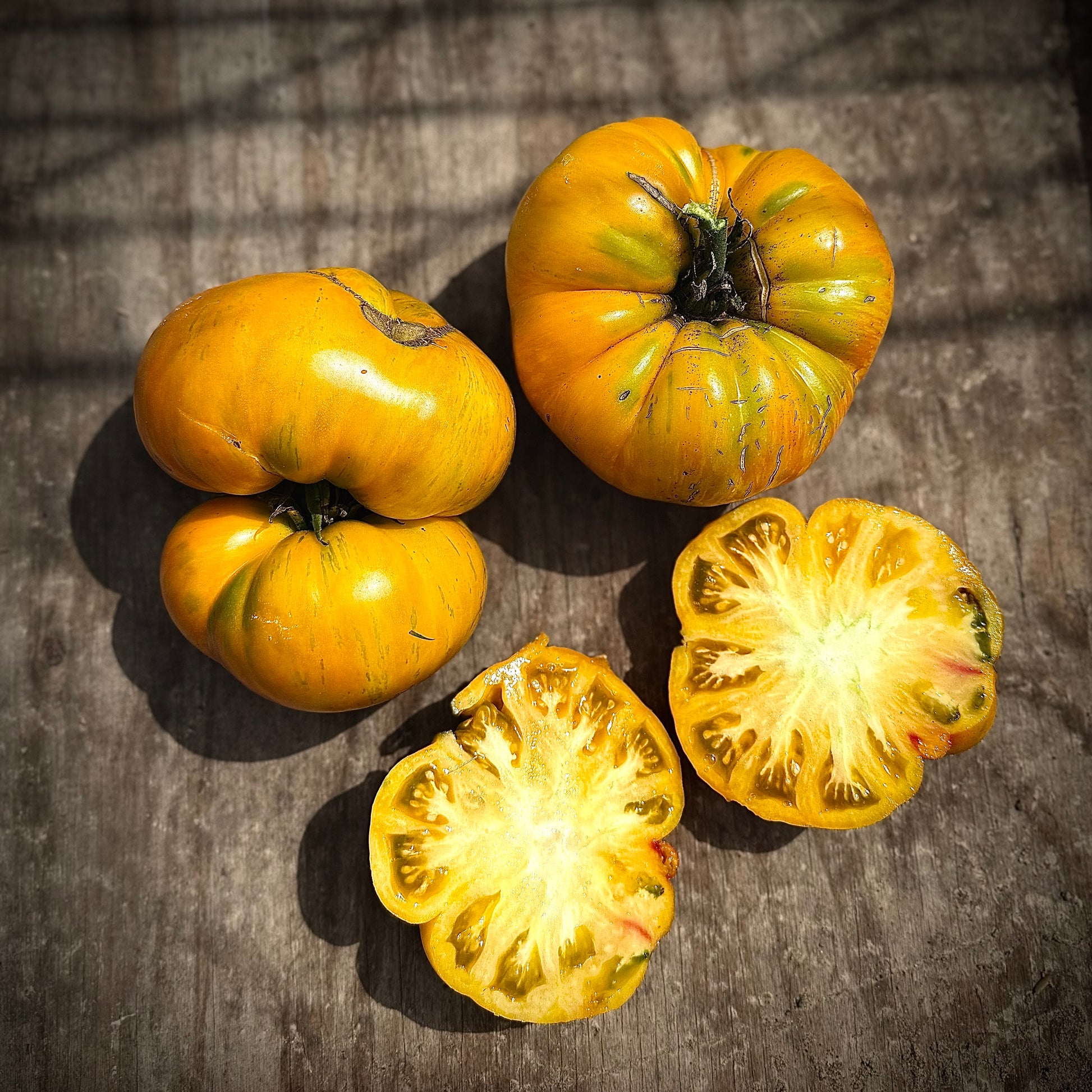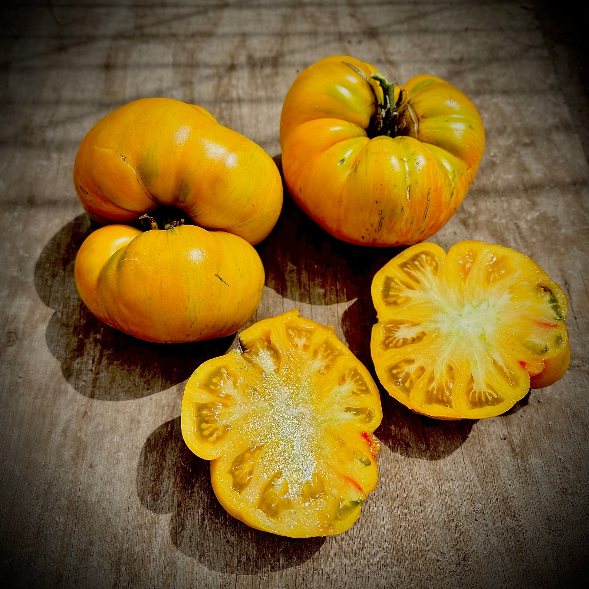 The Beauty King tomato is truly a showstopper in the garden 🍅✨. Large and round to slightly oblate. Its skin glows with a golden-yellow base, streaked and marbled with deep scarlet-red striping that wraps dramatically around the fruit. The colors bleed into each other in a flame-like pattern, giving every tomato a unique, artistic appearance. Inside, the flesh mirrors the outside beauty—warm yellow to golden tones swirled with rosy red, making every slice look like a masterpiece. Fruits are often hefty, weighing a pound or more, with a smooth, slightly ribbed shape and a glossy finish that makes them gleam in the sun 🌞. Indeterminate variety