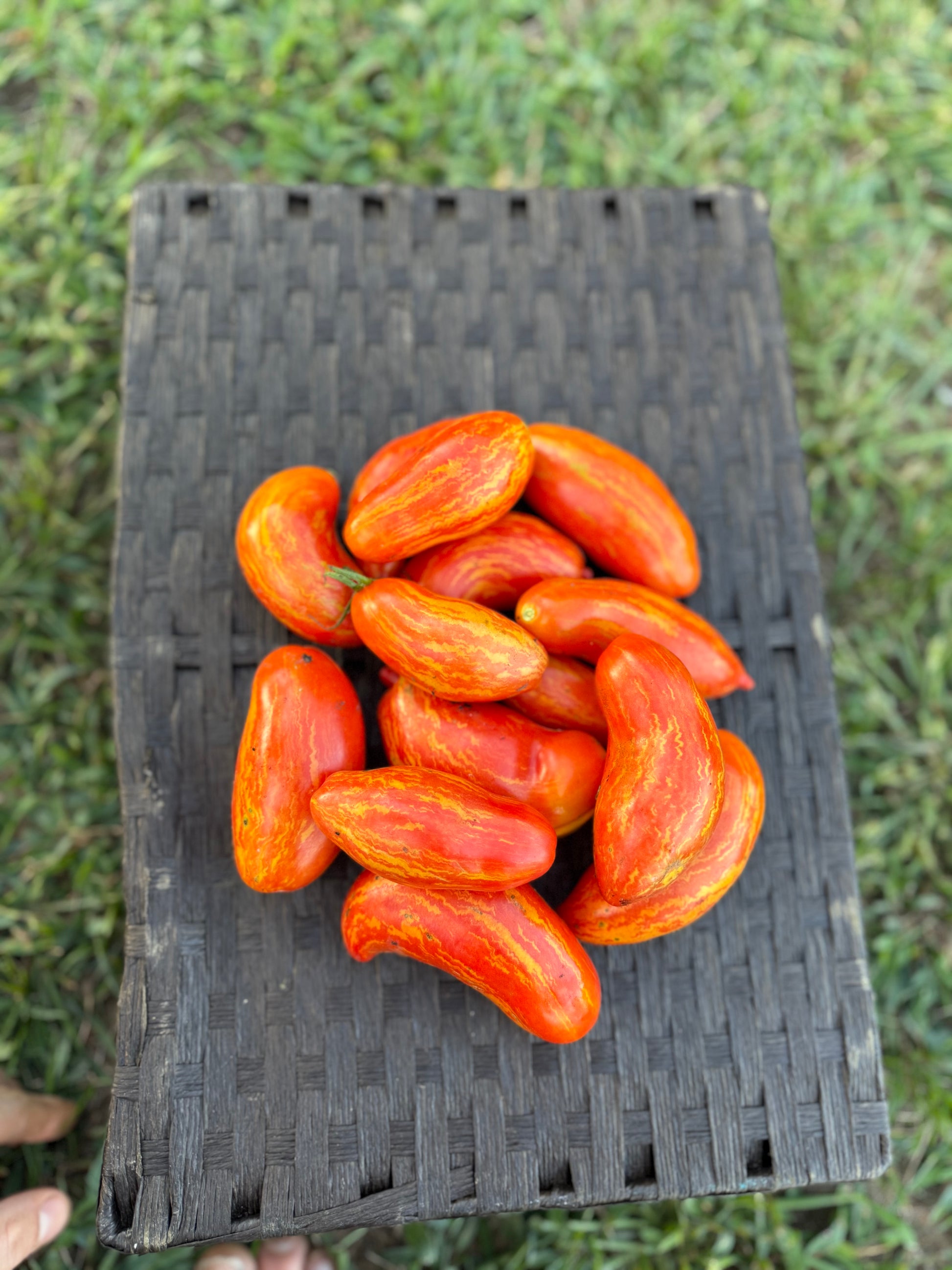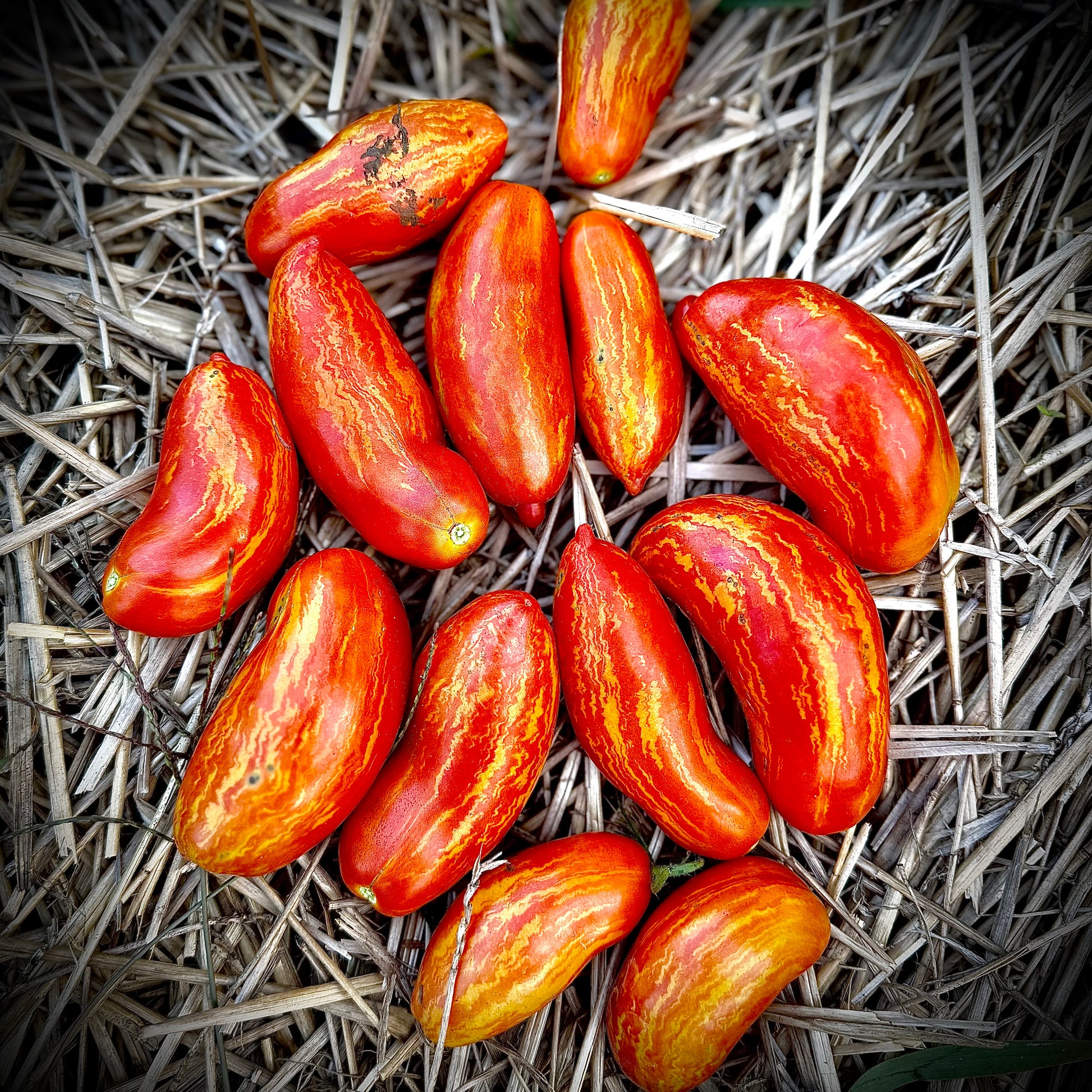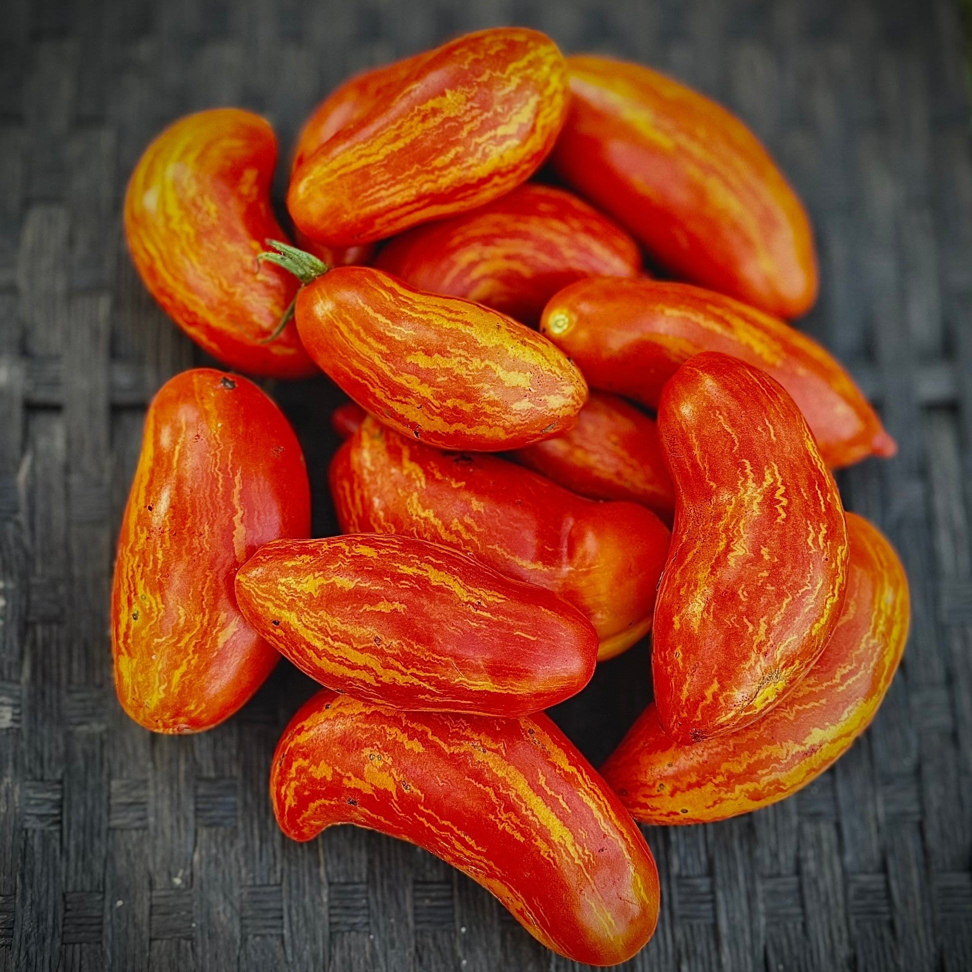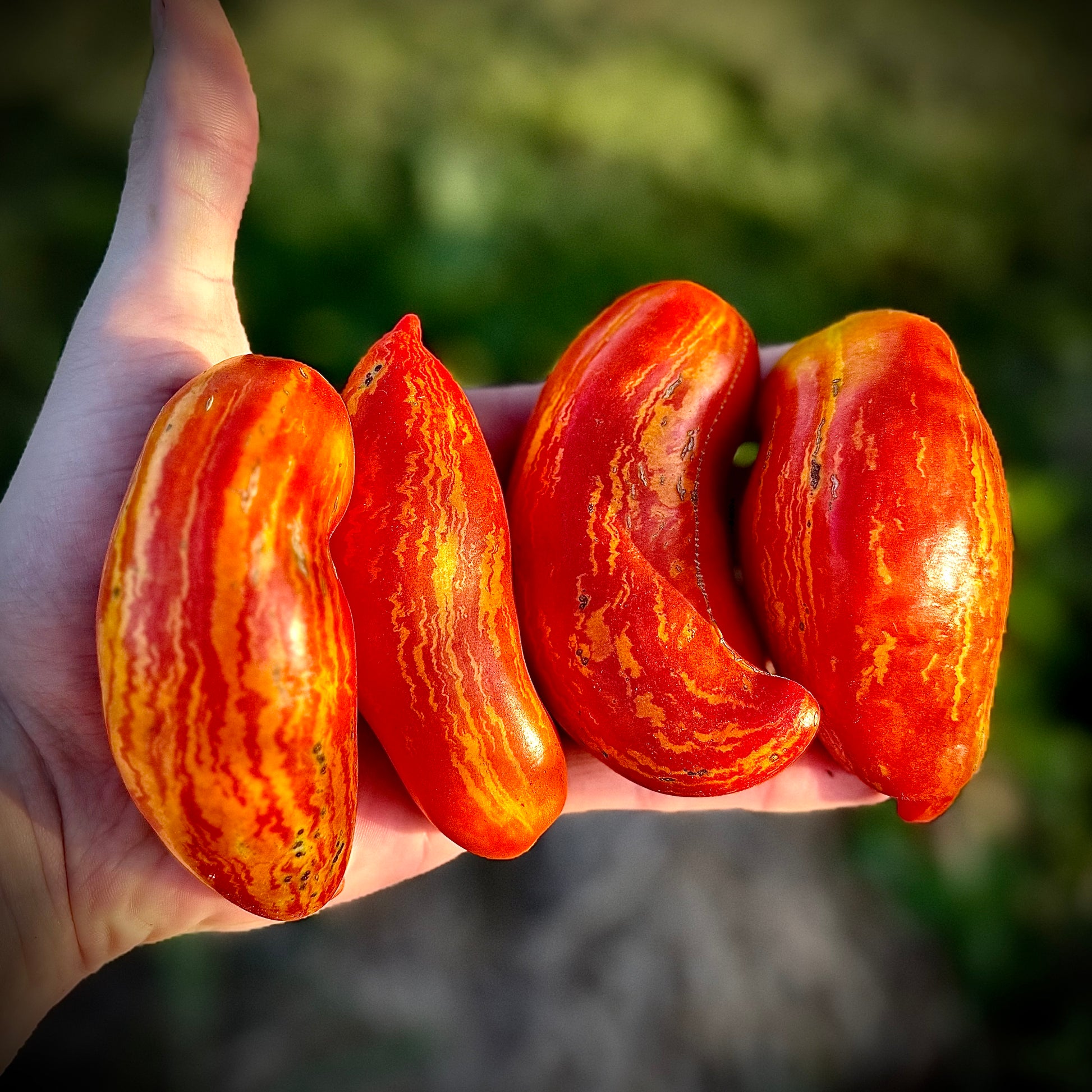 Cassidy’s Folly is like a flaming Roma with way more pizzazz! 🌟 Instead of plain, uniform fruit, this variety produces long, and sometimes curled tomatoes that look like they were dipped in lava! Their skins glow with deep reddish/pink tones streaked and striped with golden yellow, giving each one a fiery, marbled appearance. Inside, the flesh is meaty yet juicy, with a rich, balanced flavor that shines in fresh slices, sauces, or roasting. Equal parts delicious and dramatic, Cassidy’s Folly is a tomato that brings wild artistry to your garden and your kitchen.