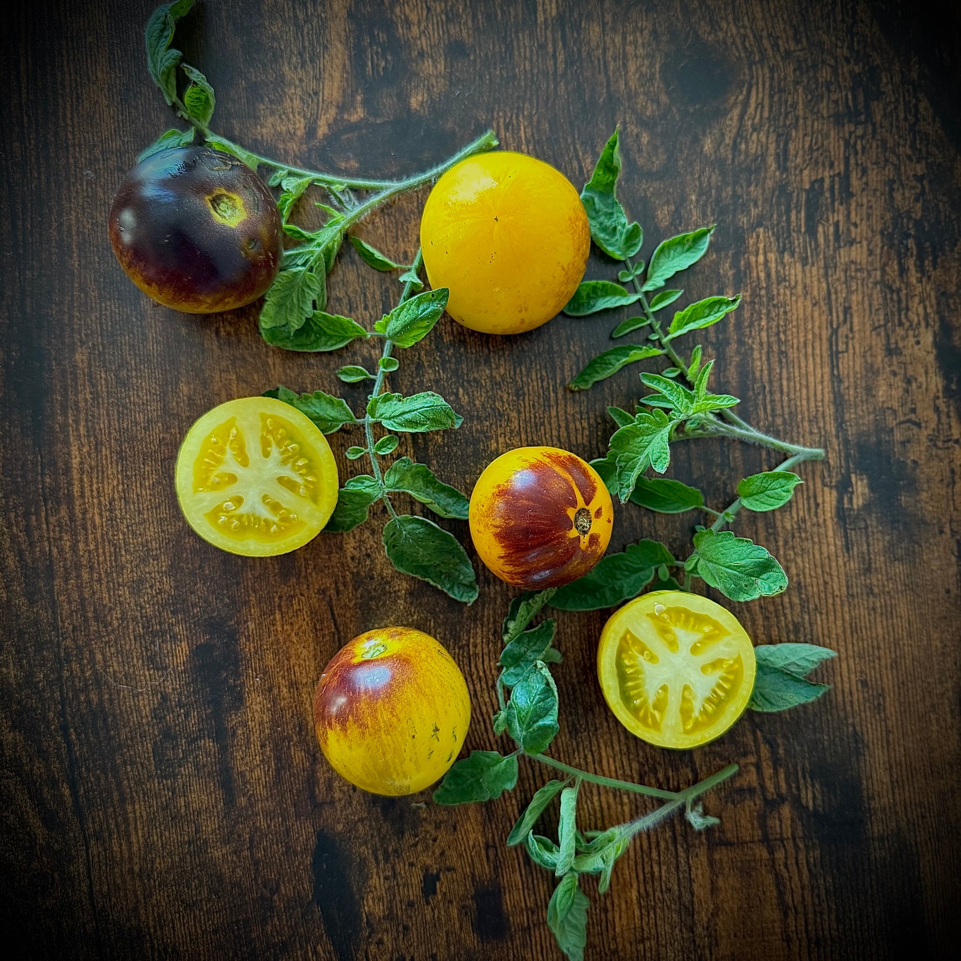 The Dark Knight tomato is a dramatic and flavorful variety, prized for its deep purple to nearly black shoulders that contrast beautifully with its bright banana yellow base. Medium in size at about 4-5 ounces, this tomato has a smooth, glossy skin and firm, juicy flesh inside. Its flavor balances sweet and tangy notes with a complex, creamy undertone that makes it perfect for fresh eating, slicing, or adding depth to salads and sauces. A Very rare variety with us being one of the only suppliers!! Indeterminate