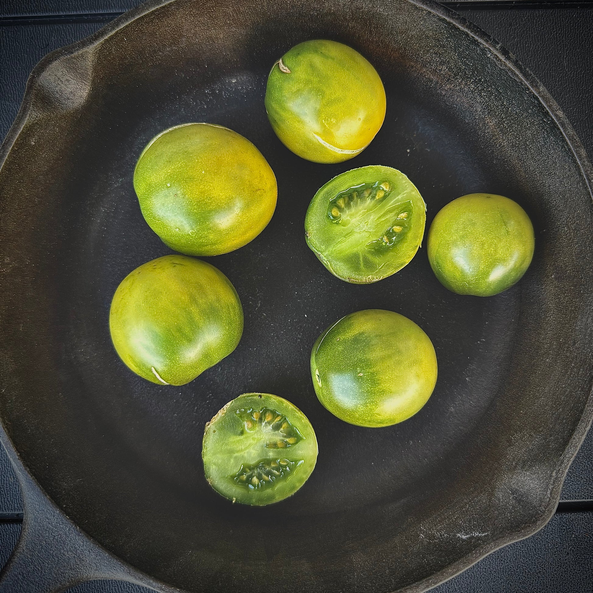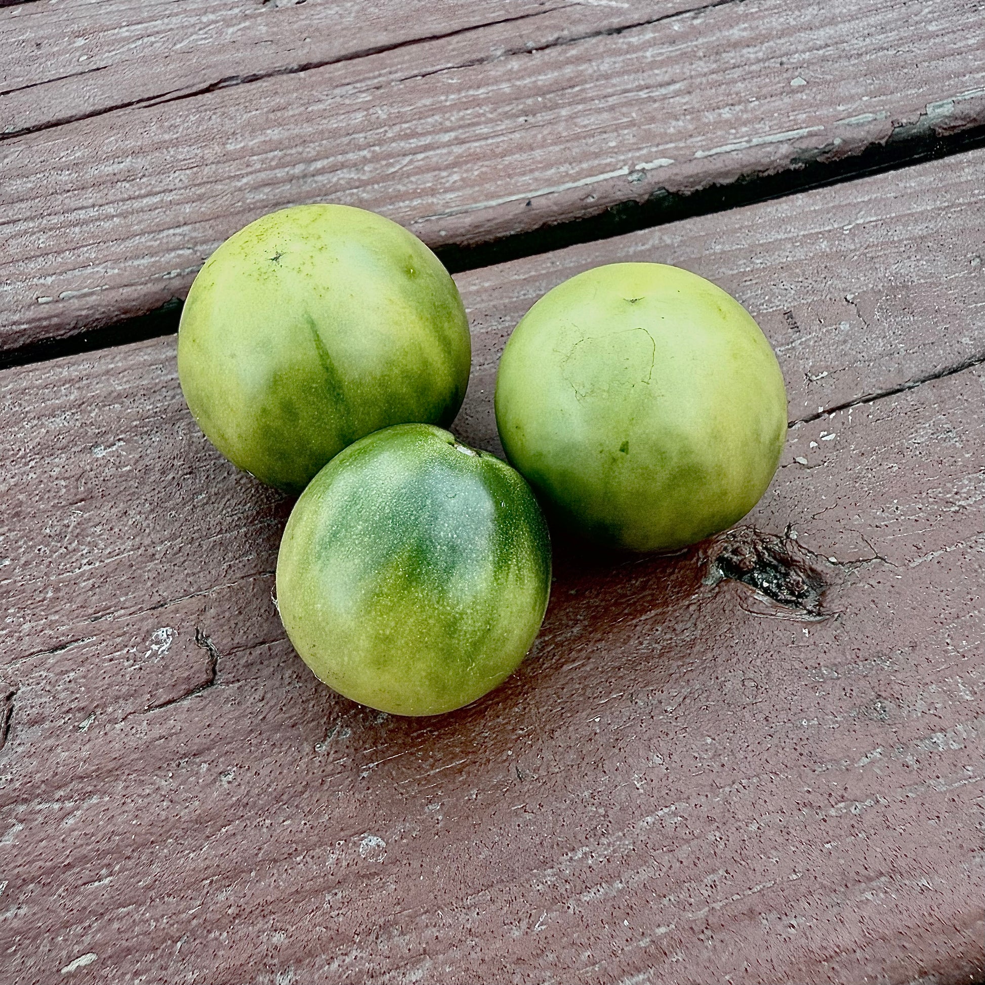 The Esmeralda Golosina tomato looks like a handful of polished gemstones scattered across the vine. Each fruit is small and round, about the size of a golf ball, and shines with a smooth, glossy skin. The base color is a glowing emerald green! a delicious green-when-ripe tomato that makes fried green tomatoes so much better! Plants get very tall and load up with these mid to later in the season! Indeterminate