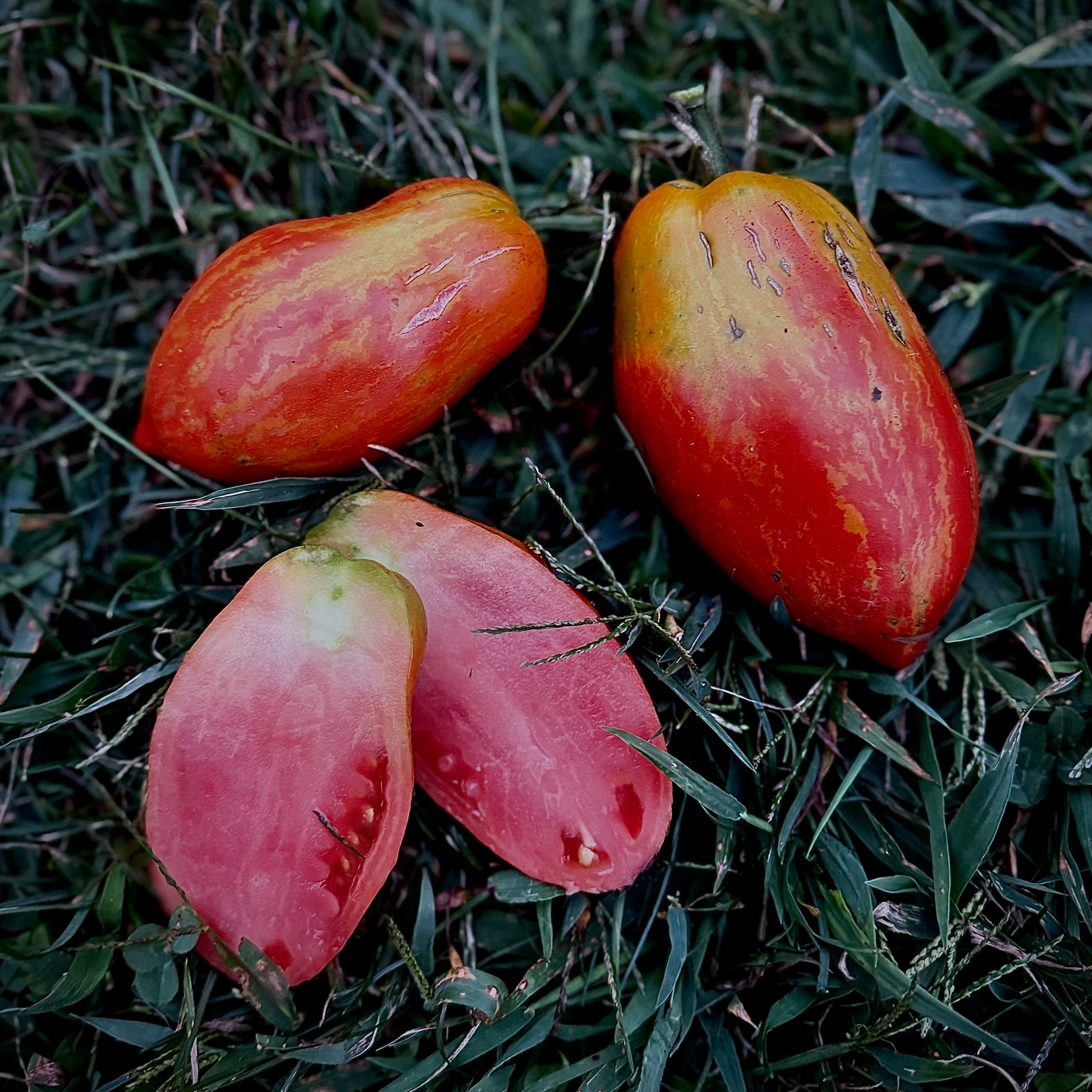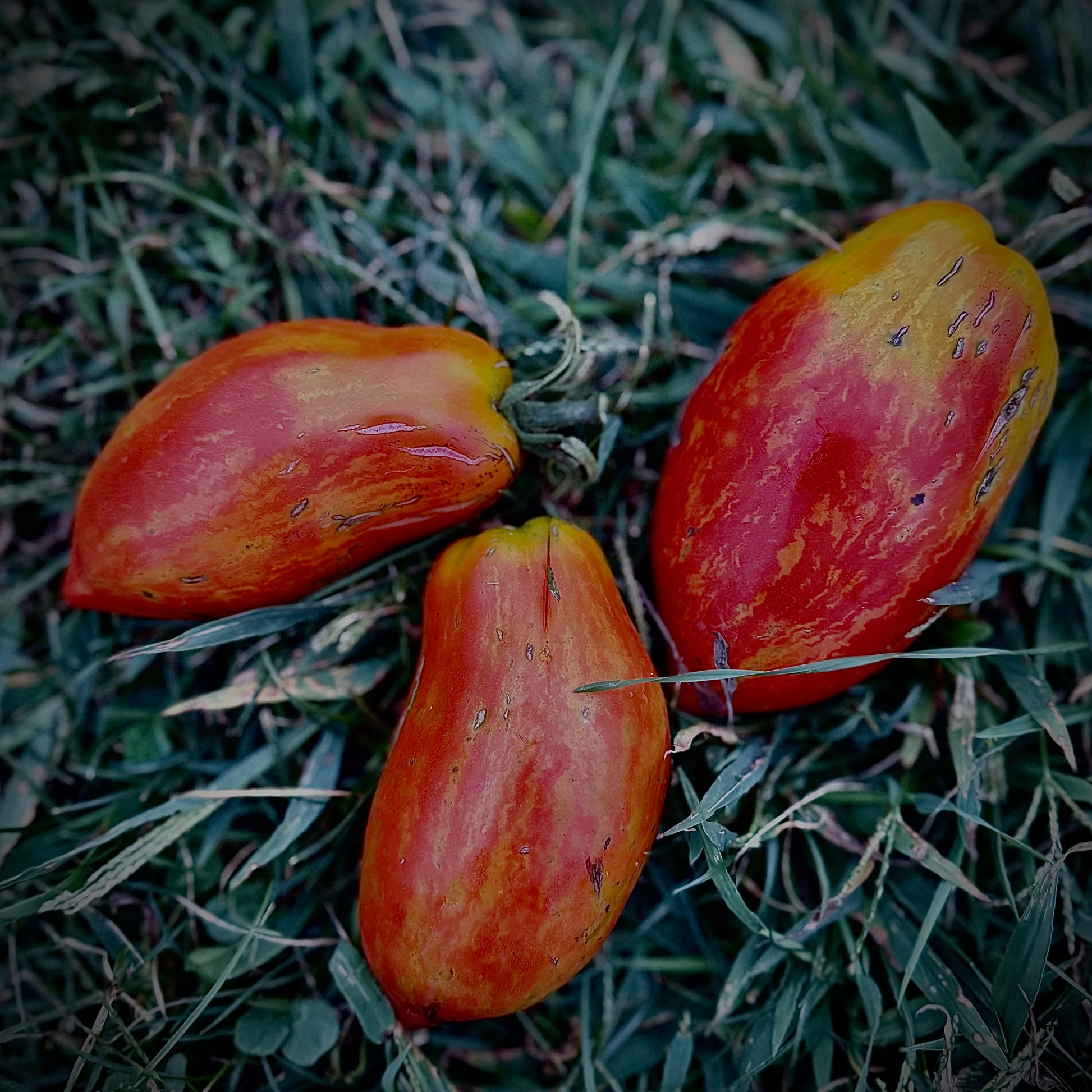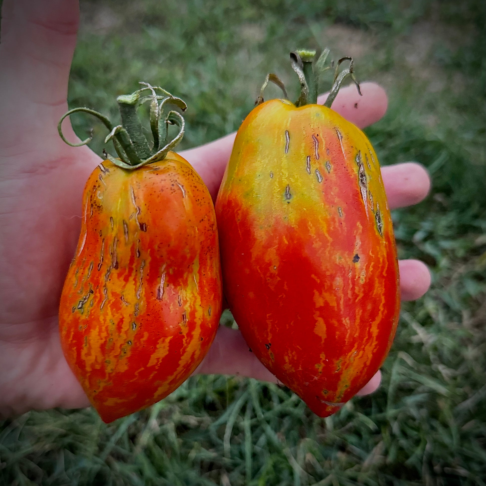 The Firebird’s Feather tomato is a showstopper with colors as bold as its name. The fruits are elongated, slender, and slightly curved, shaped almost like little flames or feathers. Their skin is a brilliant sunset blend of red, orange, and golden streaks, creating a marbled, fiery pattern across the surface. Inside, the flesh mirrors the outside with rich orange-red tones and meaty texture, low in seeds and perfect for slicing or roasting.