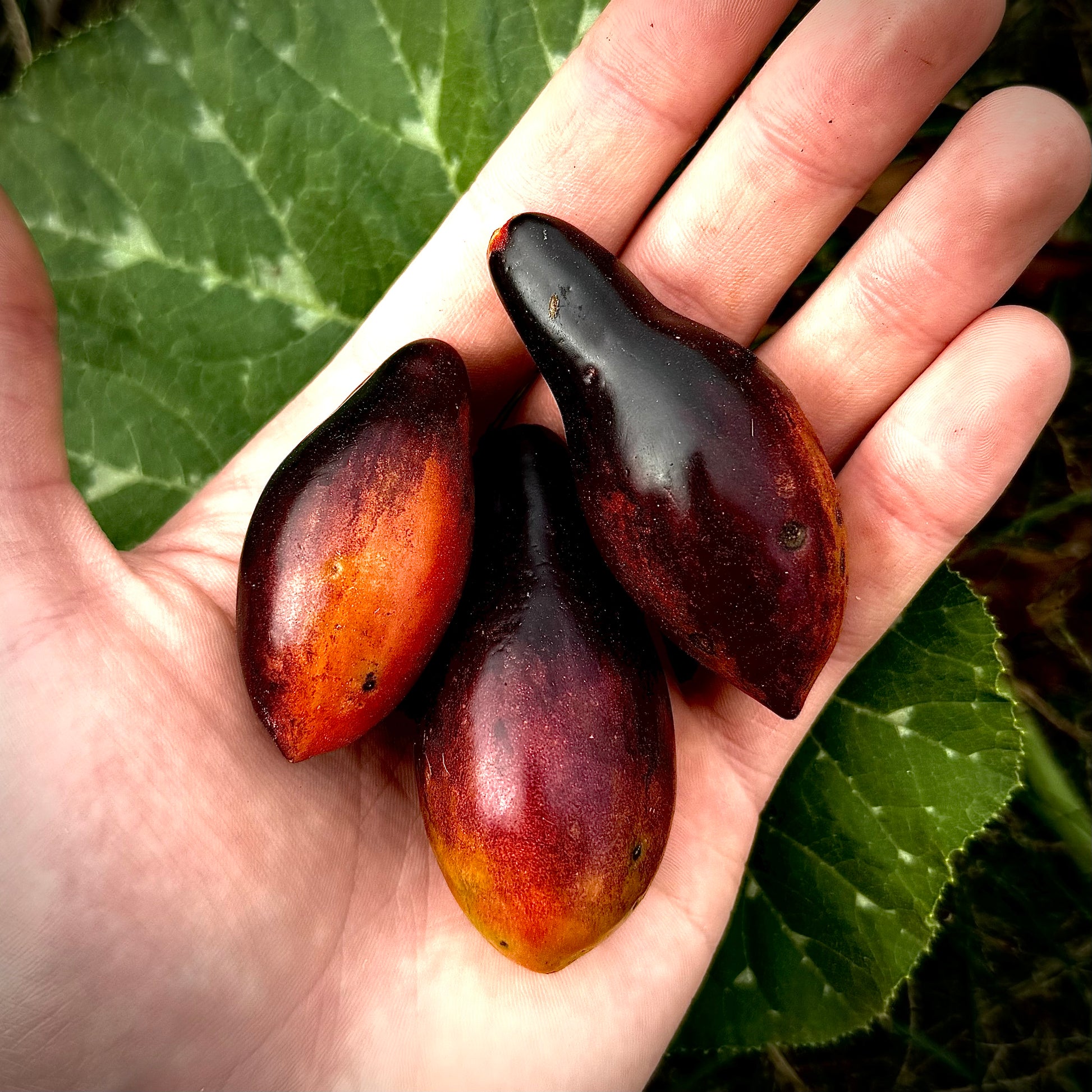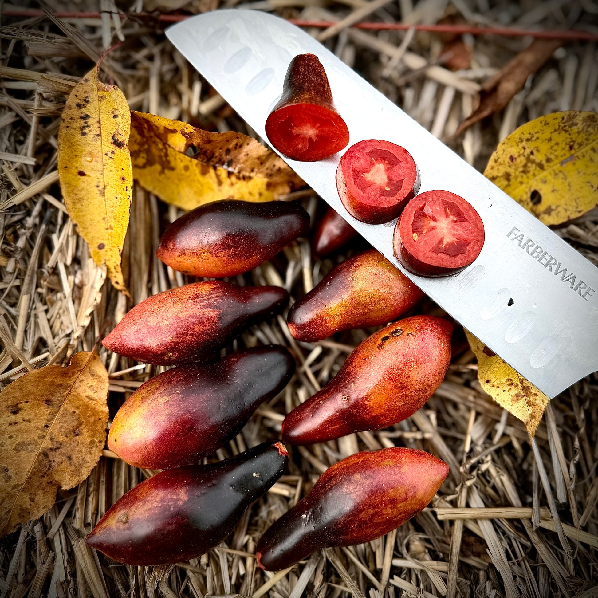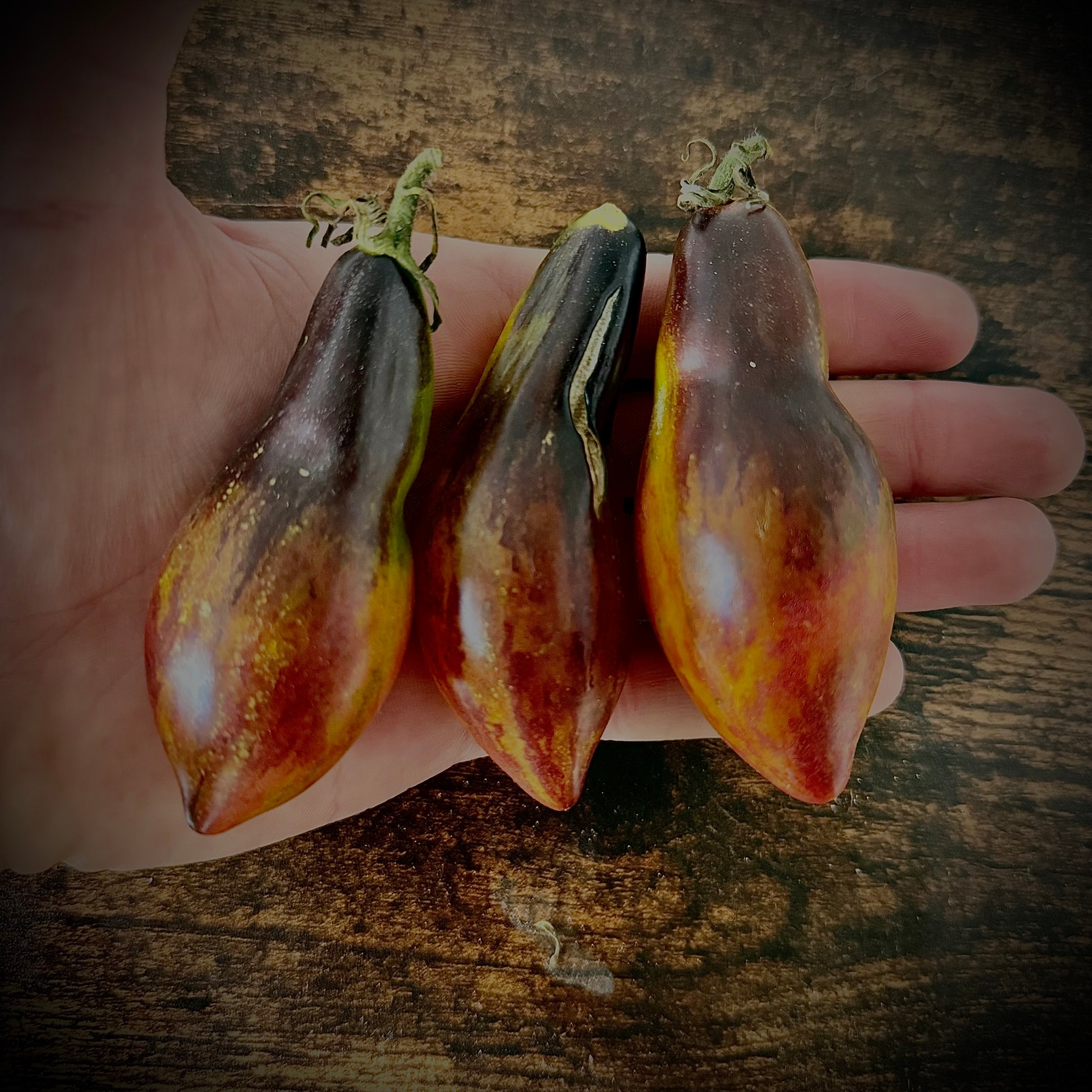 The Pink Panther tomato is a true eye-catcher in the garden. Its fruit is elongated and slender, almost like a small Roma or mini-plum, with a smooth glossy skin that ripens to a striking rosy-pink shade. 🌸🍅 The color is soft yet vibrant, giving it an elegant, almost pastel look compared to the deeper reds of standard tomatoes. When sliced open, the flesh is firm, meaty, and nearly seedless, glowing with a rich blush hue inside. Plants are productive and heavy-bearing, often hanging with clusters of these sleek pink fruits that dangle like ornaments. The overall look is both delicate and bold, making it a standout variety in any tomato patch.