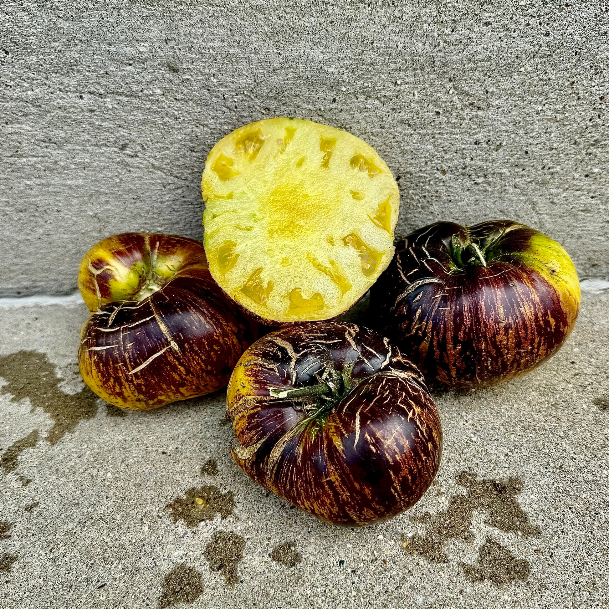 The Sun Queen Tomato is a radiant little beauty that lives up to its name. These fruits glow with a bright golden-yellow hue, dark indigo shouldering and a soft orange blush as they ripen. Beefsteak type tomatoes are round, smooth-skinned and glossy, standing out like drops of sunshine among the dark green foliage. Clusters of fruit ripen together, giving the plant a cheerful, almost ornamental look in the garden. Their color and sheen make them look like orbs of light, perfect for adding brightness to summer salads and garden harvest baskets. Semi Indeterminate