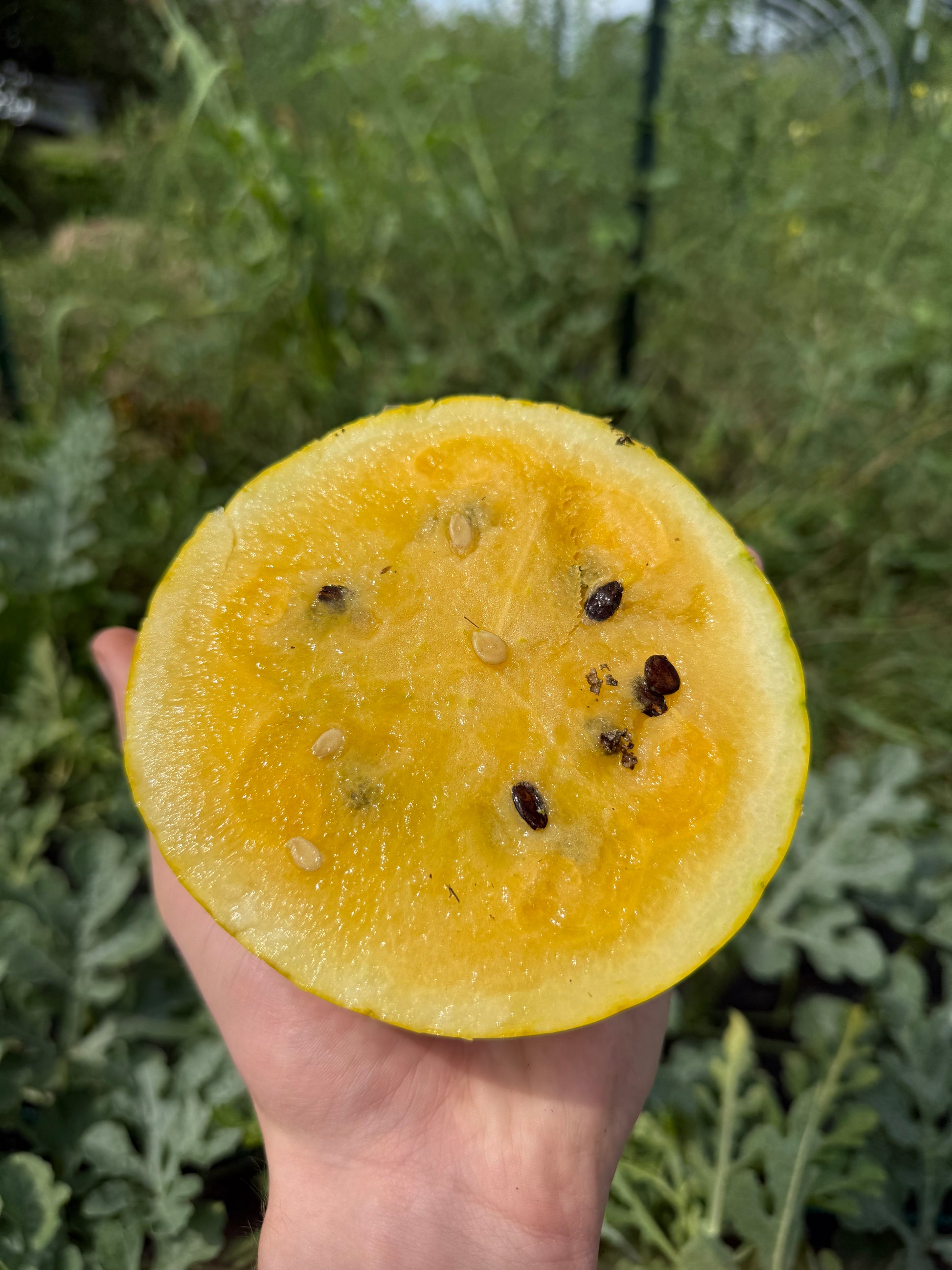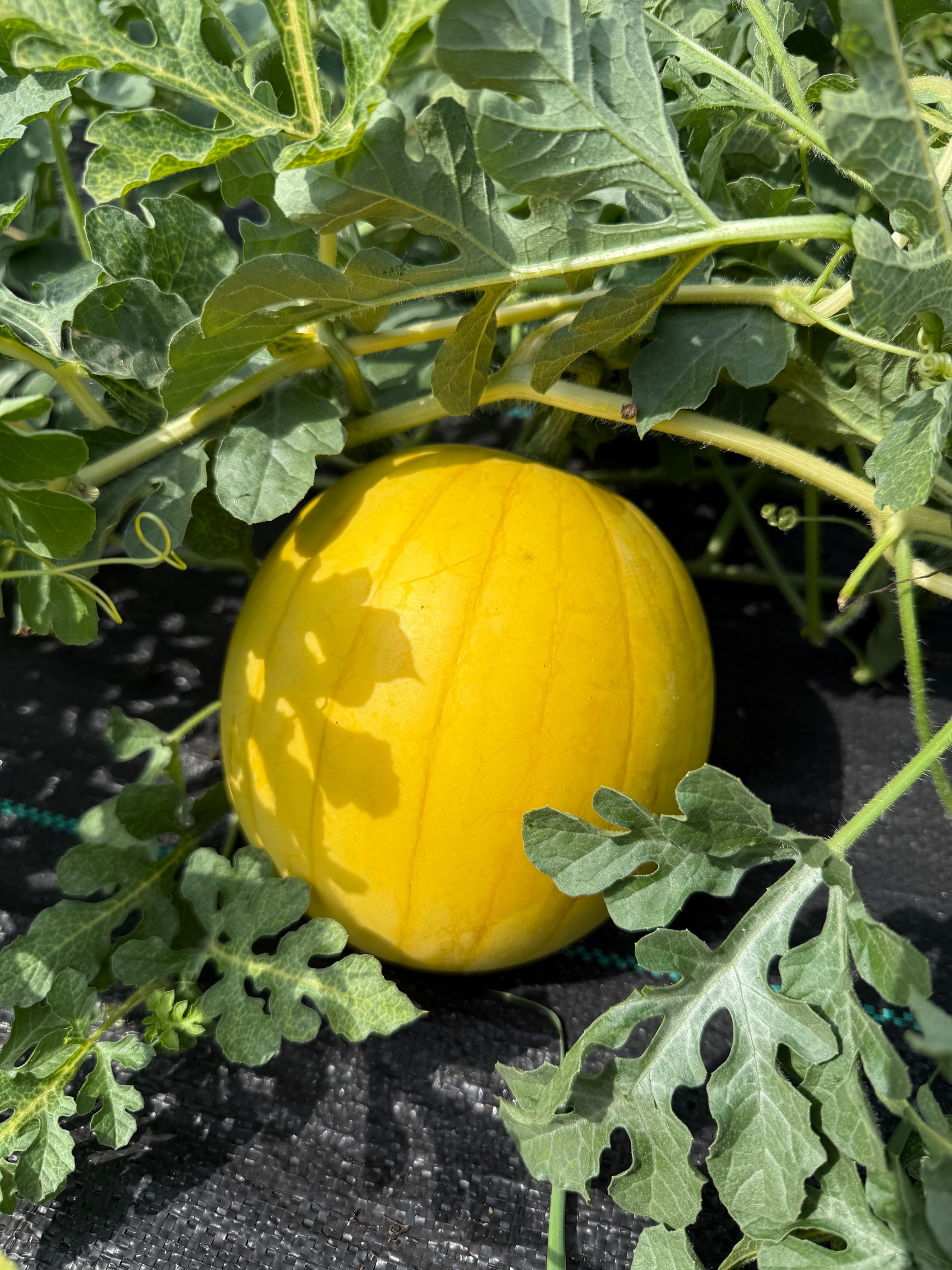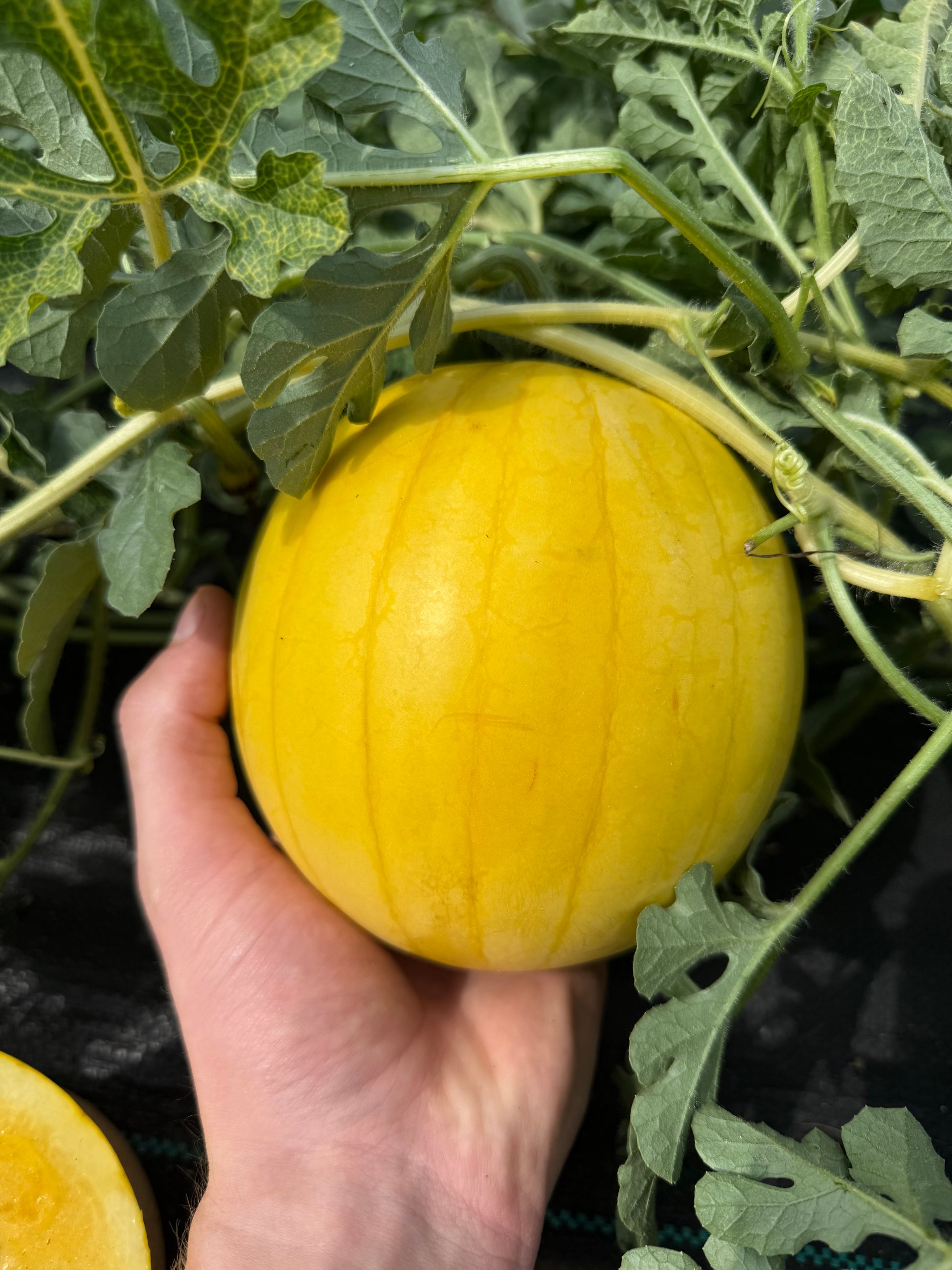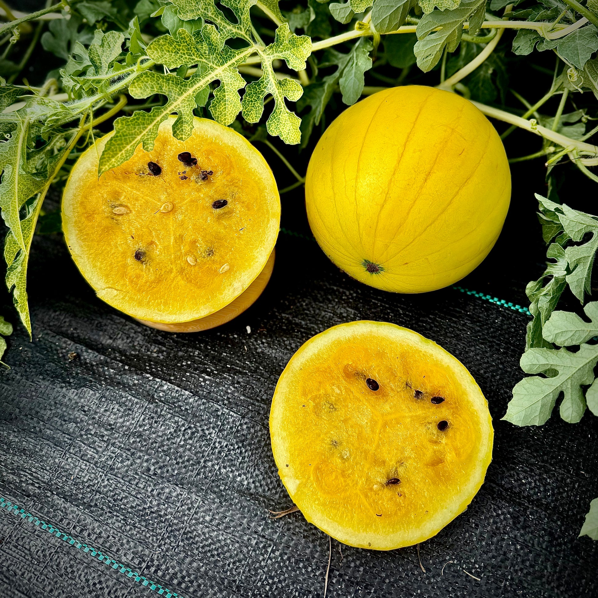 The Lemon Drop watermelon is a striking, unusual, and early maturing variety that lives up to its name! On the outside, it has the classic round-to-oblong watermelon shape with a smooth, lemon-yellow rind which sets it apart from traditional green watermelon! Inside, the flesh is a brilliant yellow, glowing almost like sunshine when sliced open. Its texture is crisp and juicy, but what makes it truly unique is the flavor—refreshingly sweet, thin walled and edible right to the rind! Medium-sized fruits average around 5-8 pounds, making them perfect for sharing, and their bright flesh makes them a showstopper on fruit platters or summer picnics. Compact plants produce an abundance of these yellow jewels! A select few will stay a light green. By far the most unique watermelon variety we trialed in 2026!